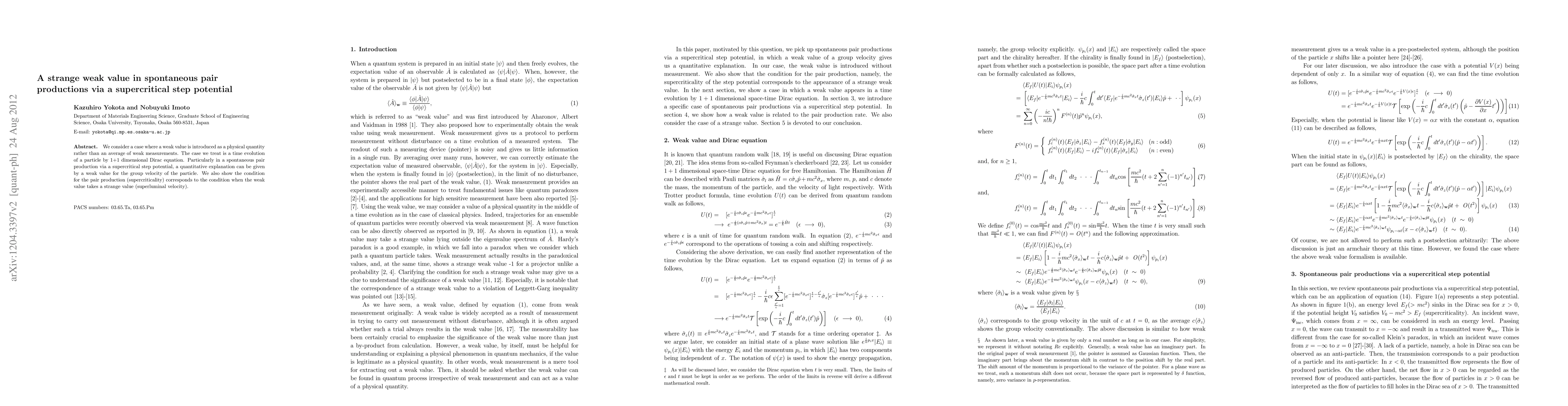 We consider a case where a weak value is introduced as a physical quantity rather than an average of weak measurements. The case we treat is a time evolution of a particle by 1+1 dimensional Dirac equation. Particularly in a spontaneous pair production via a supercritical step potential, a quantitative explanation can be given by a weak value for the group velocity of the particle. We also show the condition for the pair production (supercriticality) corresponds to the condition when the weak value takes a strange value (superluminal velocity).