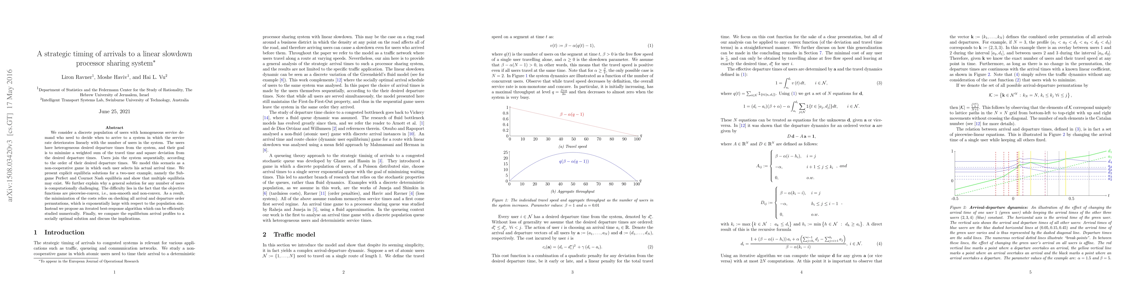 We consider a discrete population of users with homogeneous service demand who need to decide when to arrive to a system in which the service rate deteriorates linearly with the number of users in the system. The users have heterogeneous desired departure times from the system, and their goal is to minimize a weighted sum of the travel time and square deviation from the desired departure times. Users join the system sequentially, according to the order of their desired departure times. We model this scenario as a non-cooperative game in which each user selects his actual arrival time. We present explicit equilibria solutions for a two-user example, namely the subgame perfect and Nash equilibria and show that multiple equilibria may exist. We further explain why a general solution for any number of users is computationally challenging. The difficulty lies in the fact that the objective functions are piecewise convex, i.e., non-smooth and non-convex. As a result, the minimization of the costs relies on checking all arrival and departure order permutations, which is exponentially large with respect to the population size. Instead we propose an iterated best-response algorithm which can be efficiently studied numerically. Finally, we compare the equilibrium arrival profiles to a socially optimal solution and discuss the implications.