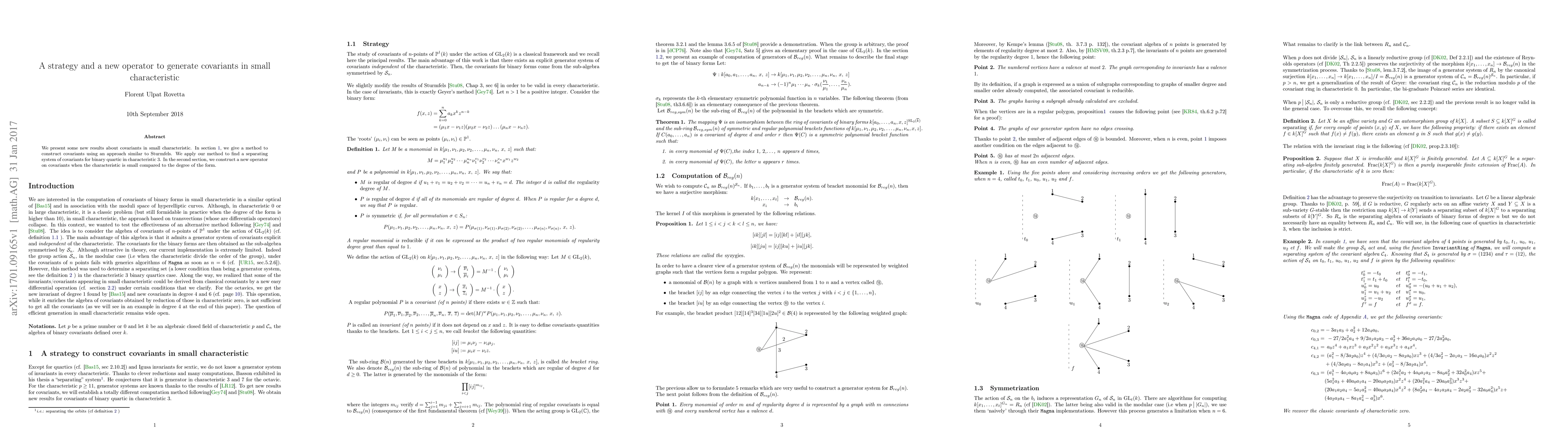We present some new results about covariants in small characteristic. In section 1, we give a method to construct covariants using an approach similar to Sturmfels. We apply our method to find a separating system of covariants for binary quartic in characteristic 3. In the second section, we construct a new operator on covariants when the characteristic is small compared to the degree of the form.