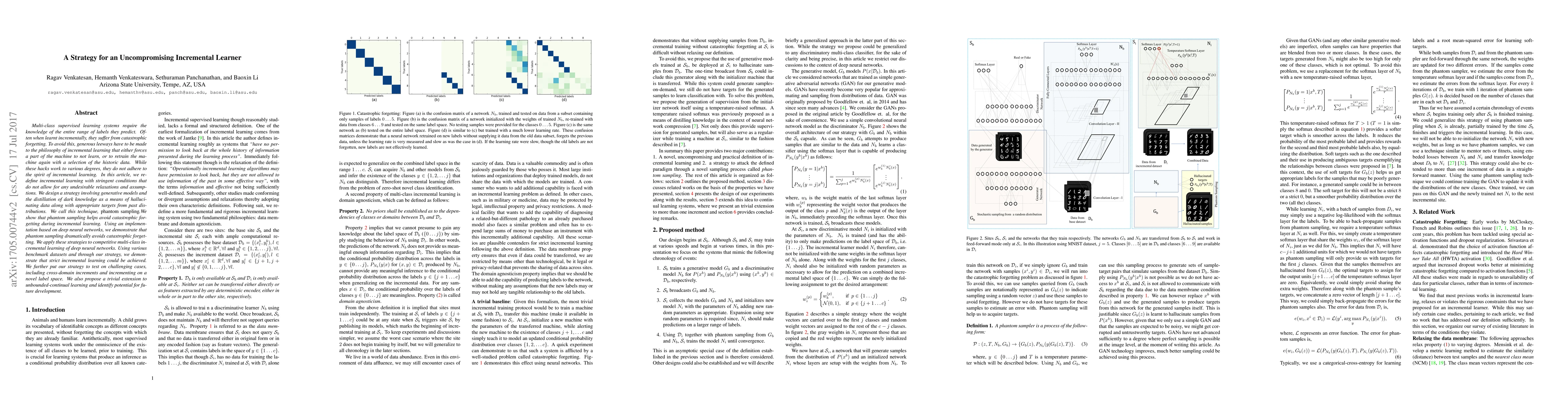 Multi-class supervised learning systems require the knowledge of the entire range of labels they predict. Often when learnt incrementally, they suffer from catastrophic forgetting. To avoid this, generous leeways have to be made to the philosophy of incremental learning that either forces a part of the machine to not learn, or to retrain the machine again with a selection of the historic data. While these hacks work to various degrees, they do not adhere to the spirit of incremental learning. In this article, we redefine incremental learning with stringent conditions that do not allow for any undesirable relaxations and assumptions. We design a strategy involving generative models and the distillation of dark knowledge as a means of hallucinating data along with appropriate targets from past distributions. We call this technique, phantom sampling.We show that phantom sampling helps avoid catastrophic forgetting during incremental learning. Using an implementation based on deep neural networks, we demonstrate that phantom sampling dramatically avoids catastrophic forgetting. We apply these strategies to competitive multi-class incremental learning of deep neural networks. Using various benchmark datasets and through our strategy, we demonstrate that strict incremental learning could be achieved. We further put our strategy to test on challenging cases, including cross-domain increments and incrementing on a novel label space. We also propose a trivial extension to unbounded-continual learning and identify potential for future development.