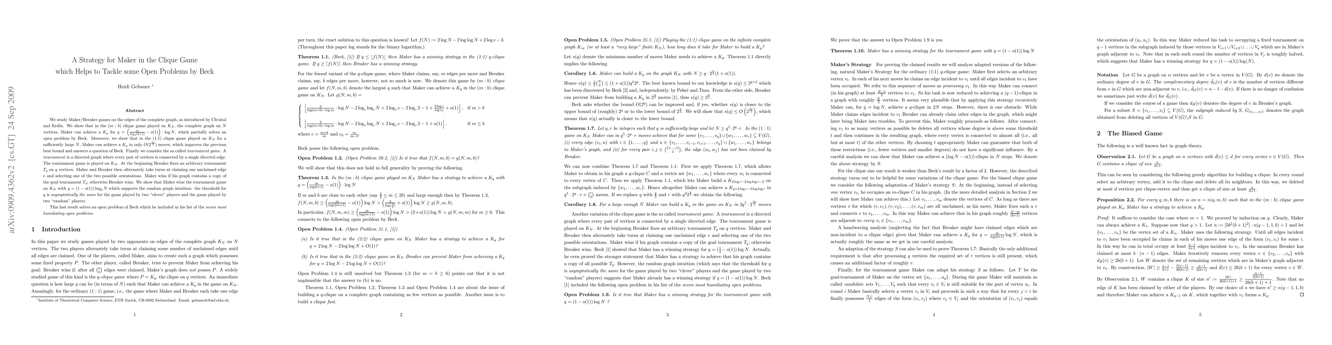 We study Maker/Breaker games on the edges of the complete graph, as introduced by Chvatal and Erdos. We show that in the (m:b) clique game played on K_{N}, the complete graph on N vertices, Maker can achieve a K_{q} for q = (m/(log_{2}(b + 1)) - o(1)) * log N, which partially solves an open problem by Beck. Moreover, we show that in the (1:1) clique game played on K_{N} for a sufficiently large N, Maker can achieve a K_{q} in only 2^(2q/3) moves, which improves the previous best bound and answers a question of Beck. Finally we consider the so called tournament game. A tournament is a directed graph where every pair of vertices is connected by a single directed edge. The tournament game is played on K_{N}. At the beginning Breaker fixes an arbitrary tournament T_{q} on q vertices. Maker and Breaker then alternately take turns at claiming one unclaimed edge e and selecting one of the two possible orientations. Maker wins if his graph contains a copy of the goal tournament T_{q}; otherwise Breaker wins. We show that Maker wins the tournament game on K_{N} with q = (1 - o(1))*log_{2}(N) which supports the random graph intuition: the threshold for q is asymptotically the same for the game played by two "clever'' players and the game played by two ``random'' players. This last result solves an open problem of Beck which he included in his list of the seven most humiliating open problems.