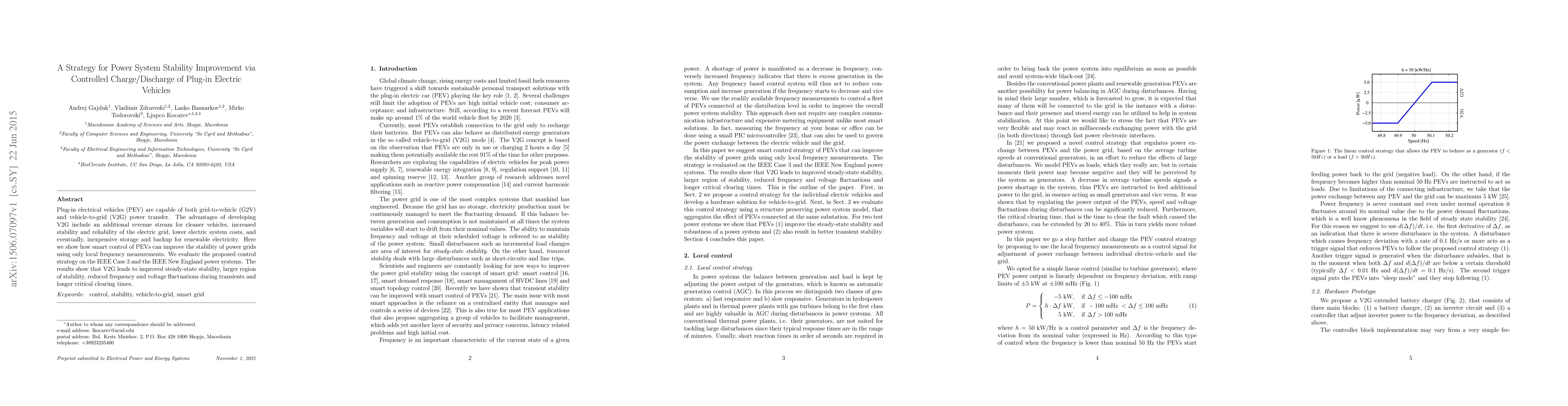 This paper proposes a strategy to enhance power system stability using controlled charge/discharge of plug-in electric vehicles (PEVs) via vehicle-to-grid (V2G) technology. The smart control of PEVs, based on local frequency measurements, improves grid stability, reduces fluctuations, and extends critical clearing times, as demonstrated on IEEE Case 3 and New England systems.