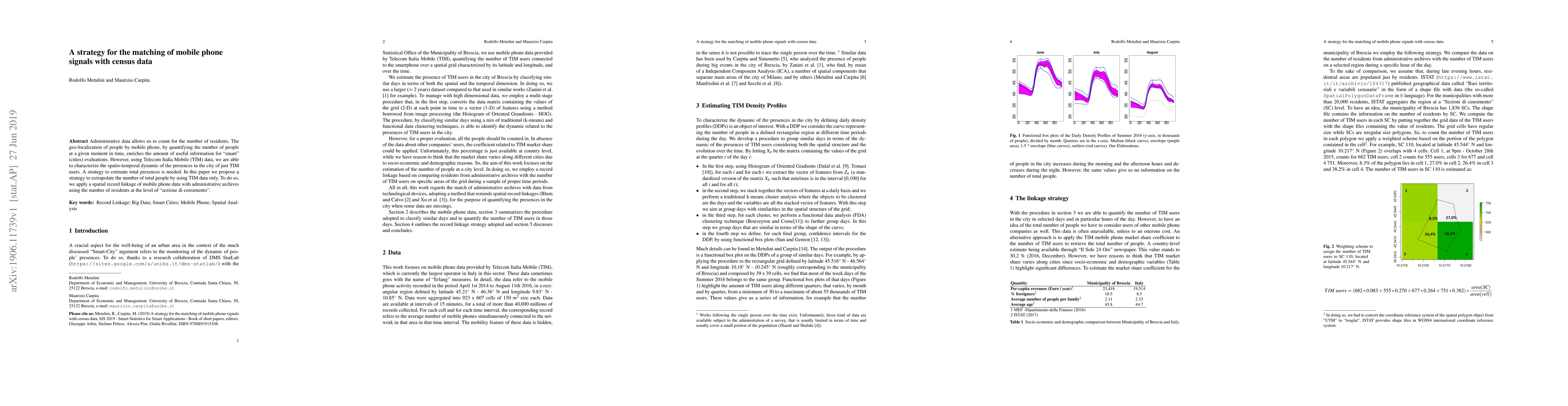This paper proposes a strategy to match mobile phone signals from Telecom Italia Mobile (TIM) with census data to estimate the total number of people present in a city. It uses spatial record linkage to correlate TIM data with administrative archives, leveraging resident counts at the census section level to extrapolate total presences.