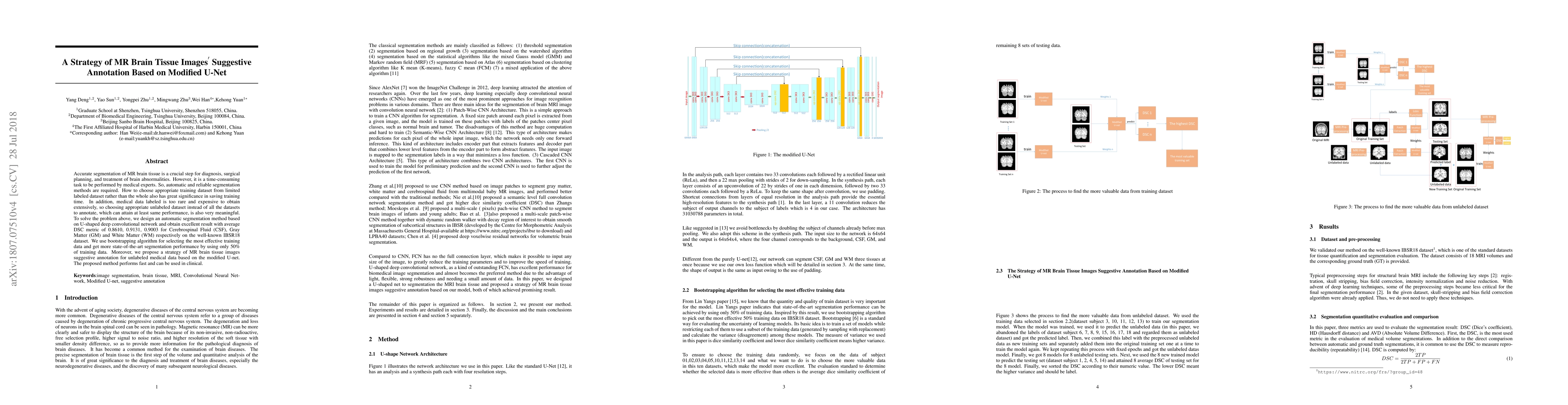 Accurate segmentation of MR brain tissue is a crucial step for diagnosis,surgical planning, and treatment of brain abnormalities. However,it is a time-consuming task to be performed by medical experts. So, automatic and reliable segmentation methods are required. How to choose appropriate training dataset from limited labeled dataset rather than the whole also has great significance in saving training time. In addition, medical data labeled is too rare and expensive to obtain extensively, so choosing appropriate unlabeled dataset instead of all the datasets to annotate, which can attain at least same performance, is also very meaningful. To solve the problem above, we design an automatic segmentation method based on U-shaped deep convolutional network and obtain excellent result with average DSC metric of 0.8610, 0.9131, 0.9003 for Cerebrospinal Fluid (CSF), Gray Matter (GM) and White Matter (WM) respectively on the well-known IBSR18 dataset. We use bootstrapping algorithm for selecting the most effective training data and get more state-of-the-art segmentation performance by using only 50% of training data. Moreover, we propose a strategy of MR brain tissue images' suggestive annotation for unlabeled medical data based on the modified U-net. The proposed method performs fast and can be used in clinical.