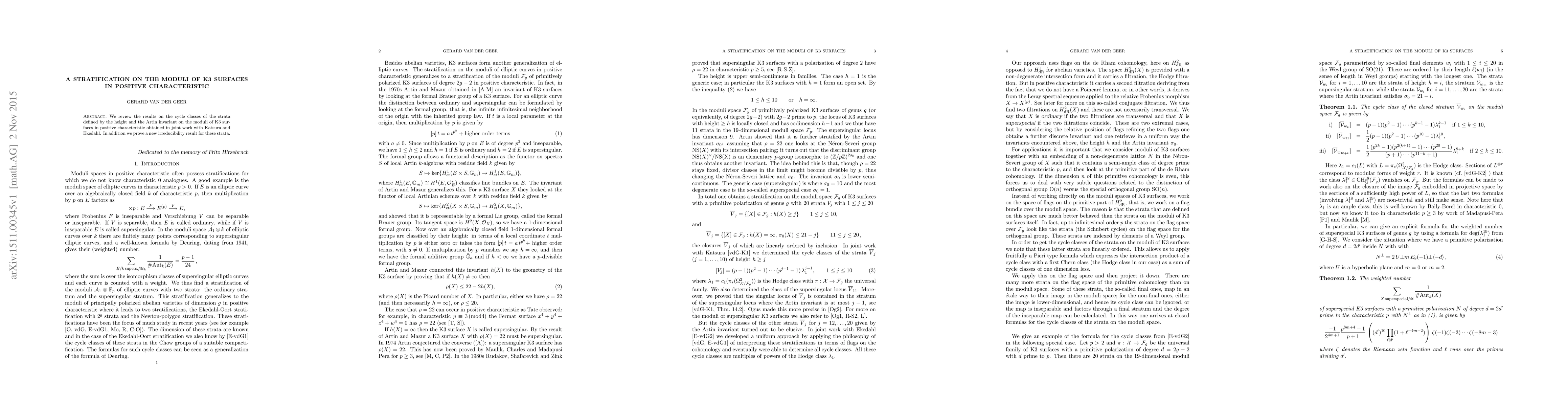 We review the results on the cycle classes of the strata defined by the height and the Artin invariant on the moduli of K3 surfaces in positive characteristic obtained in joint work with Katsura and Ekedahl. In addition we prove a new irreducibility result for these strata.