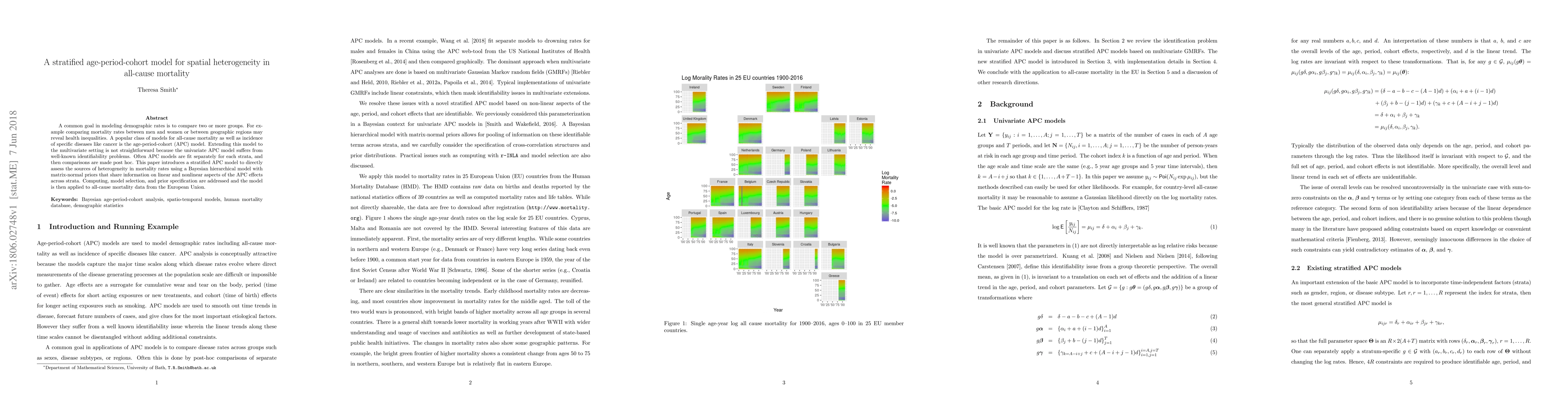 This paper proposes a stratified age-period-cohort (APC) model for analyzing spatial heterogeneity in all-cause mortality, employing a Bayesian hierarchical approach to directly assess mortality rate differences across groups. The model uses matrix-normal priors to share information across strata, addressing identifiability issues and applied to European Union mortality data.