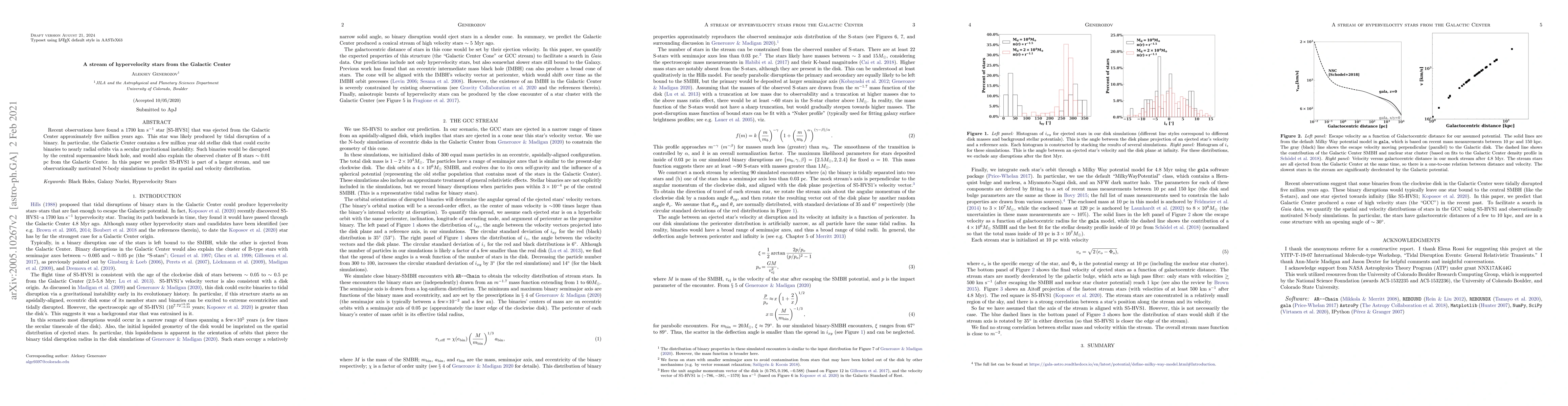 Recent observations have found a 1700 km/s star [S5-HVS1] that was ejected from the Galactic Center approximately five million years ago. This star was likely produced by tidal disruption of a binary. In particular, the Galactic Center contains a few million year old stellar disk that could excite binaries to nearly radial orbits via a secular gravitational instability. Such binaries would be disrupted by the central supermassive black hole, and would also explain the observed cluster of B stars ~0.01 pc from the Galactic Center. In this paper we predict S5-HVS1 is part of a larger stream, and use observationally motivated N-body simulations to predict its spatial and velocity distribution.