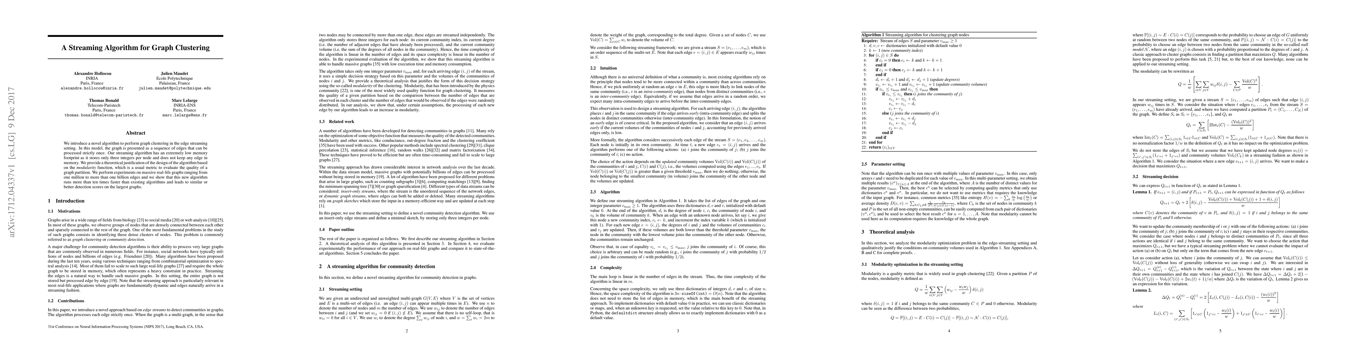 This paper presents a low-memory streaming algorithm for graph clustering that processes edges sequentially and uses only three integers per node. The algorithm is theoretically justified based on the modularity function and outperforms existing methods in speed and clustering quality on large real-life graphs.