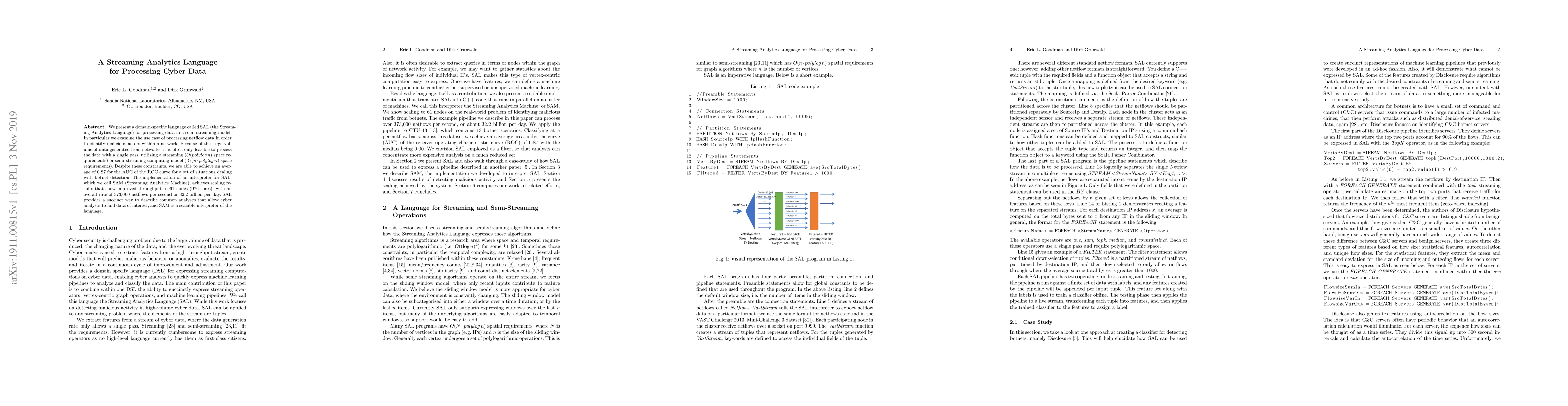 This paper introduces SAL, a domain-specific language for processing large-volume network data in a semi-streaming model, achieving an average AUC of 0.87 for botnet detection. The accompanying interpreter, SAM, scales to 61 nodes, processing 373,000 netflows per second.