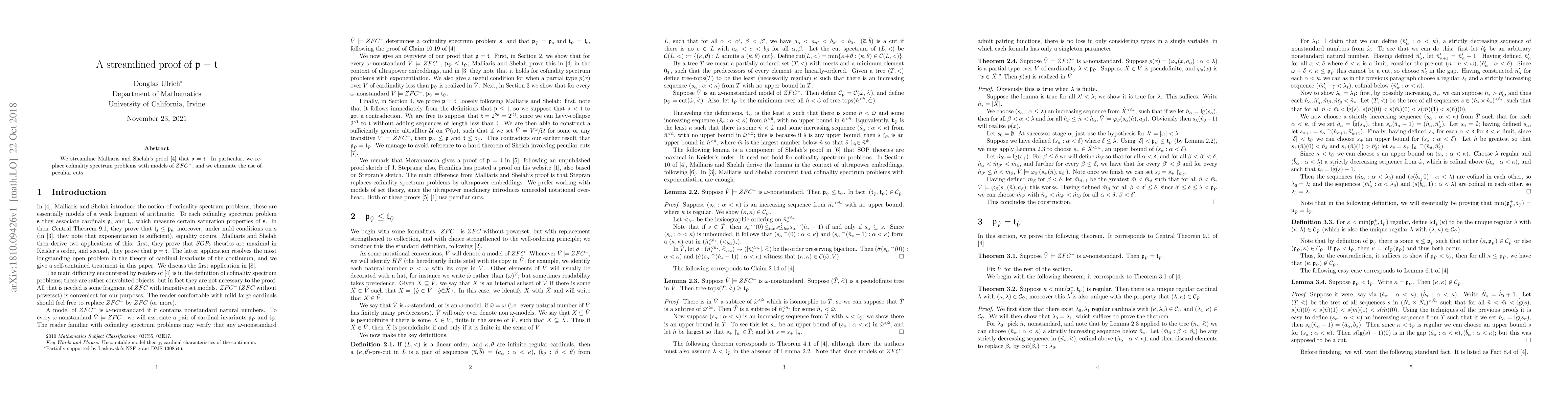 We streamline Malliaris and Shelah's proof that $\mathfrak{p} = \mathfrak{t}$. In particular, we replace cofinality spectrum problems with models of $ZFC^-$, and we eliminate the use of peculiar cuts.