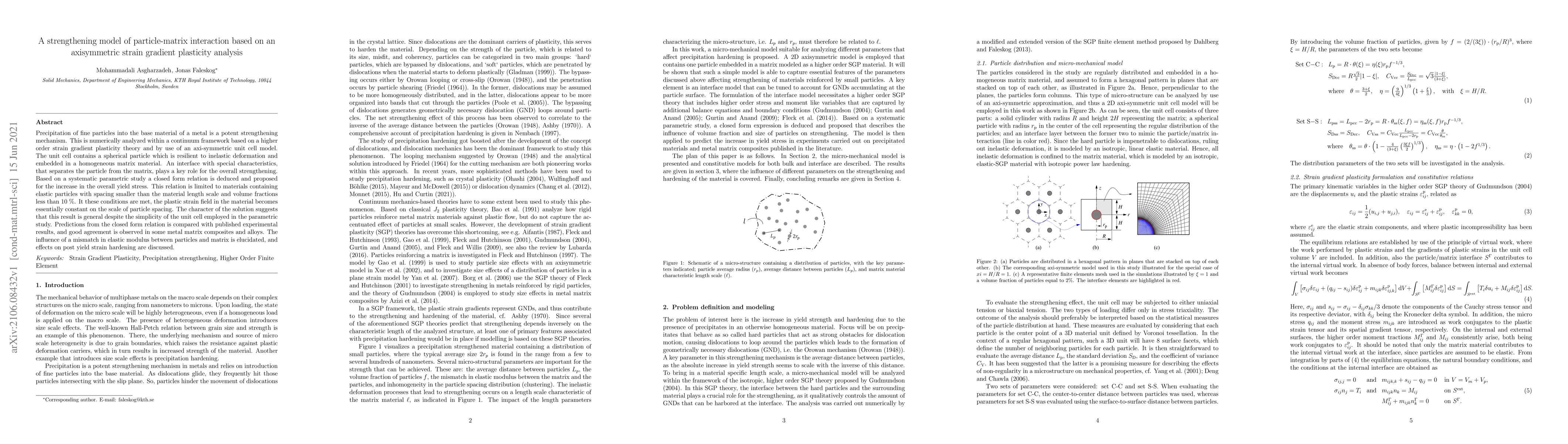 This paper develops a model for particle-matrix interaction in metal composites using axisymmetric strain gradient plasticity analysis, showing how fine particle precipitation strengthens the base material. The study proposes a closed-form relation for the increase in yield stress, validated against experimental results, and discusses the impact of elastic modulus mismatch on strain hardening.