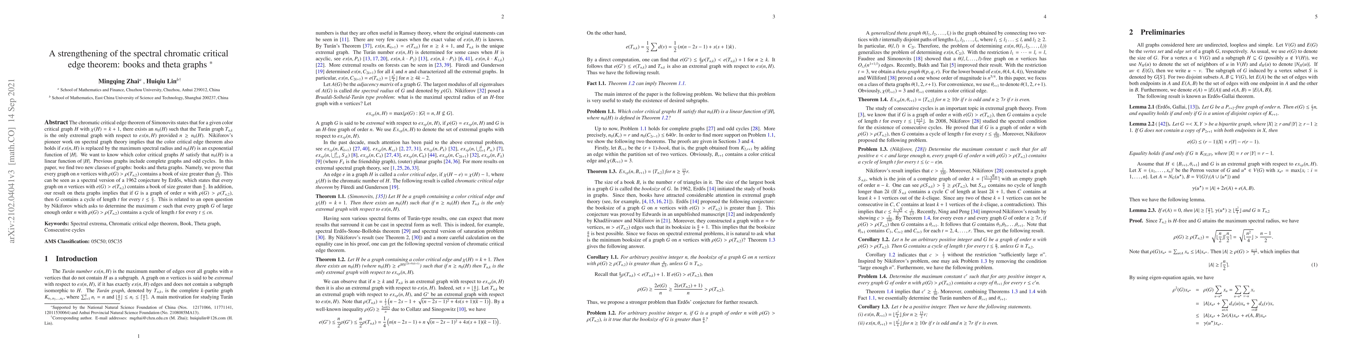 The chromatic critical edge theorem of Simonovits states that for a given color critical graph $H$ with $\chi(H)=k+1$, there exists an $n_0(H)$ such that the Tur\'an graph $T_{n,k}$ is the only extremal graph with respect to $ex(n,H)$ provided $n \geq n_0(H)$. Nikiforov's pioneer work on spectral graph theory implies that the color critical edge theorem also holds if $ex(n,H)$ is replaced by the maximum spectral radius and $n_0(H)$ is an exponential function of $|H|$. We want to know which color critical graphs $H$ satisfy that $n_0(H)$ is a linear function of $|H|$. Previous graphs include complete graphs and odd cycles. In this paper, we find two new classes of graphs: books and theta graphs. Namely, we prove that every graph on $n$ vertices with $\rho(G)>\rho(T_{n,2})$ contains a book of size greater than $\frac{n}{6.5}$. This can be seen as a spectral version of a 1962 conjecture by Erd\H{o}s, which states that every graph on $n$ vertices with $e(G)>e(T_{n,2})$ contains a book of size greater than $\frac{n}{6}$. In addition, our result on theta graphs implies that if $G$ is a graph of order $n$ with $\rho(G)>\rho(T_{n,2})$, then $G$ contains a cycle of length $t$ for every $t\leq \frac{n}{7}$. This is related to an open question by Nikiforov which asks to determine the maximum $c$ such that every graph $G$ of large enough order $n$ with $\rho(G)>\rho(T_{n,2})$ contains a cycle of length $t$ for every $t\leq cn$.