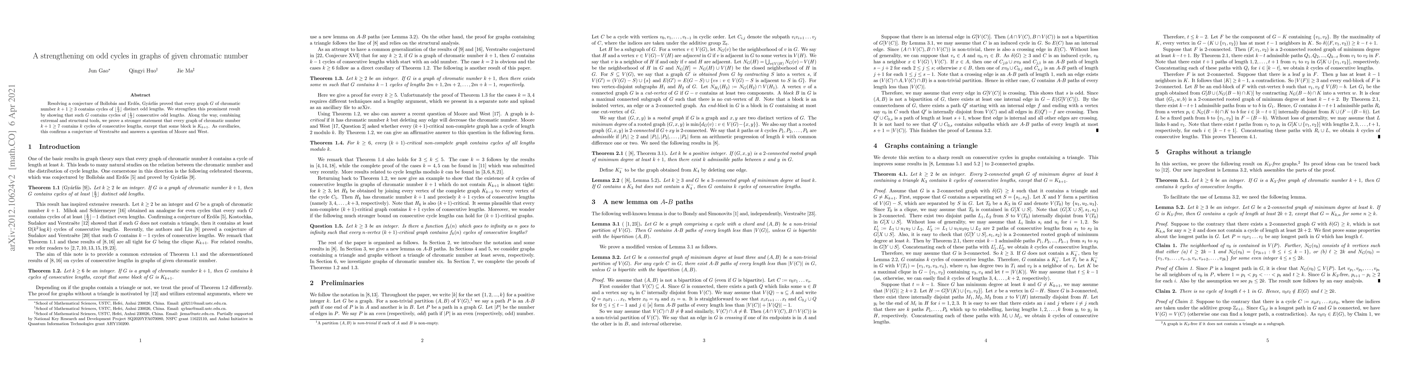 Gyárfás strengthens a conjecture by proving that every graph of chromatic number $k+1 \geq 3$ contains cycles of $\lfloor\frac{k}{2}\rfloor$ consecutive odd lengths, confirming a conjecture of Verstraëte and answering a question of Moore and West.