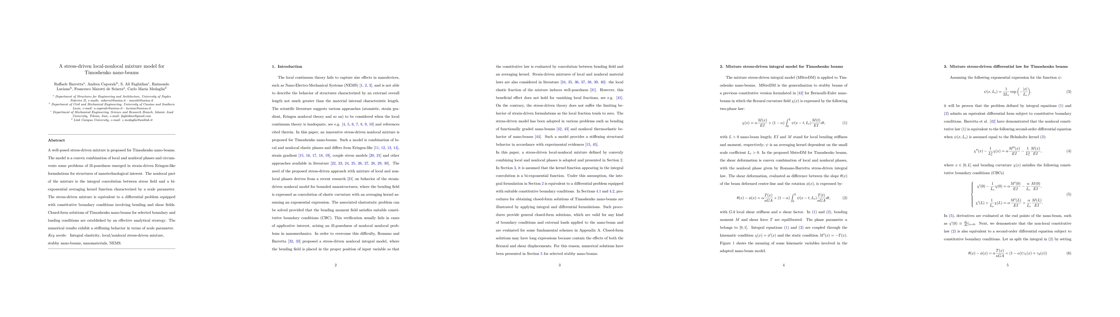 A well-posed stress-driven mixture is proposed for Timoshenko nano-beams. The model is a convex combination of local and nonlocal phases and circumvents some problems of ill-posedness emerged in strain-driven Eringen-like formulations for structures of nanotechnological interest. The nonlocal part of the mixture is the integral convolution between stress field and a bi-exponential averaging kernel function characterized by a scale parameter. The stress-driven mixture is equivalent to a differential problem equipped with constitutive boundary conditions involving bending and shear fields. Closed-form solutions of Timoshenko nano-beams for selected boundary and loading conditions are established by an effective analytical strategy. The numerical results exhibit a stiffening behavior in terms of scale parameter.