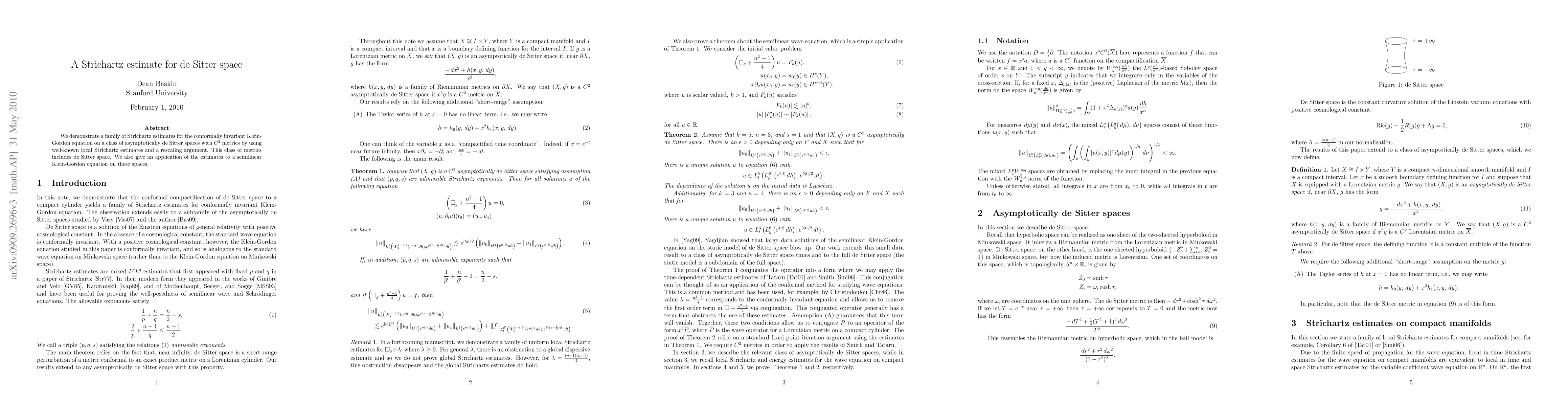 This paper establishes Strichartz estimates for the conformally invariant Klein-Gordon equation on asymptotically de Sitter spaces using local Strichartz estimates and rescaling. The results are applied to a semilinear Klein-Gordon equation in these spaces.