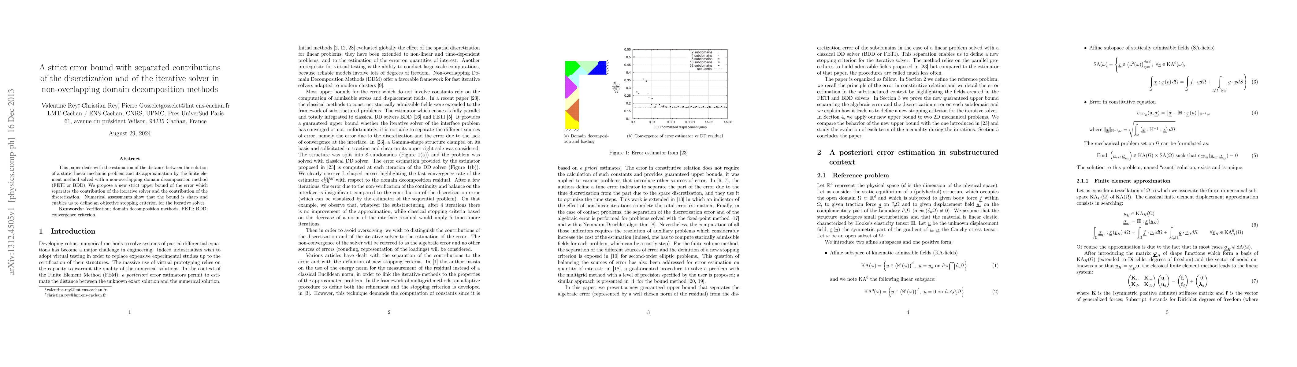 This paper deals with the estimation of the distance between the solution of a static linear mechanic problem and its approximation by the finite element method solved with a non-overlapping domain decomposition method (FETI or BDD). We propose a new strict upper bound of the error which separates the contribution of the iterative solver and the contribution of the discretization. Numerical assessments show that the bound is sharp and enables us to define an objective stopping criterion for the iterative solver
