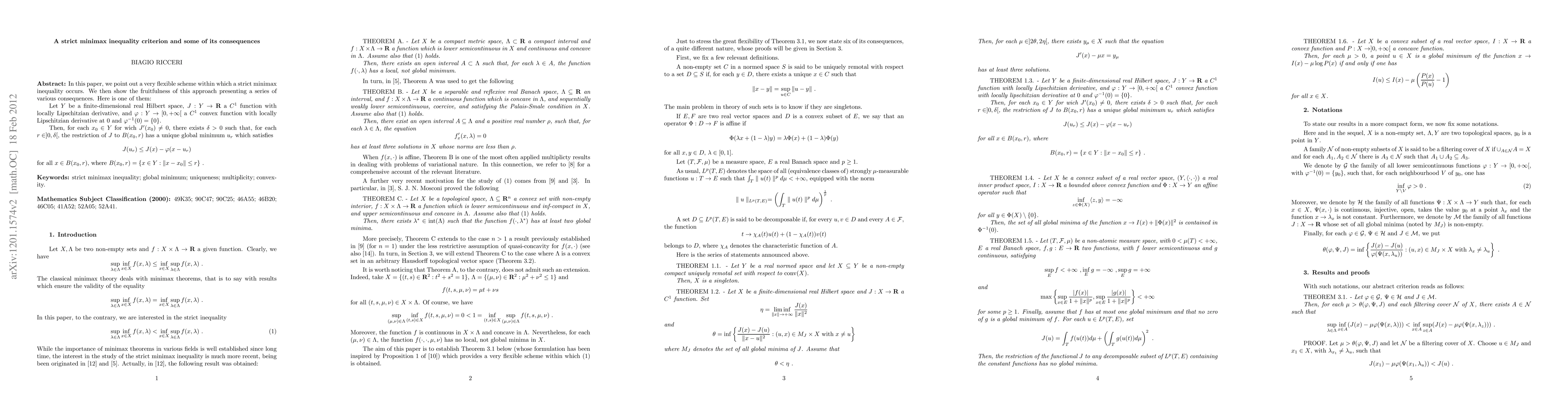 A research paper introduces a strict minimax inequality criterion for a specific function $J$ in a Hilbert space $Y$, showing its consequences, including the existence of unique global minima for restricted domains under certain conditions.