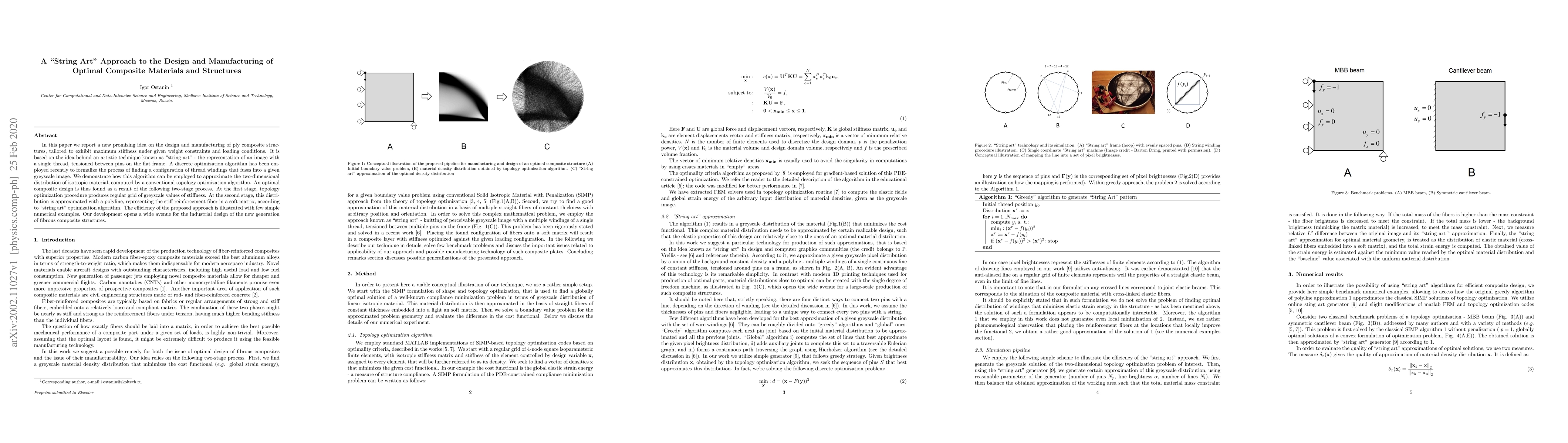 In this paper we report a new promising idea on the design and manufacturing of ply composite structures, tailored to exhibit maximum stiffness under given weight constraints and loading conditions. It is based on the idea behind an artistic technique known as "string art" - the representation of an image with a single thread, tensioned between pins on the flat frame. A discrete optimization algorithm has been employed recently to formalize the process of finding a configuration of thread windings that fuses into a given greyscale image. We demonstrate how this algorithm can be employed to approximate the two-dimensional distribution of isotropic material, computed by a conventional topology optimization algorithm. An optimal composite design is thus found as a result of the following two-stage process. At the first stage, topology optimization procedure produces regular grid of greyscale values of stiffness. At the second stage, this distribution is approximated with a polyline, representing the stiff reinforcement fiber in a soft matrix, according to ``string art'' optimization algorithm. The efficiency of the proposed approach is illustrated with few simple numerical examples. Our development opens a wide avenue for the industrial design of the new generation of fibrous composite structures.