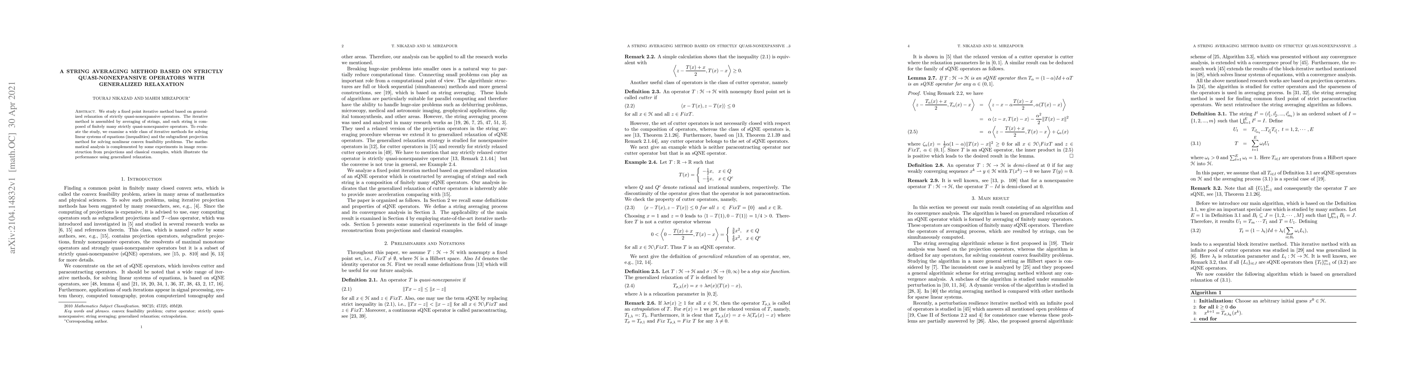 We study a fixed point iterative method based on generalized relaxation of strictly quasi-nonexpansive operators. The iterative method is assembled by averaging of strings, and each string is composed of finitely many strictly quasi-nonexpansive operators. To evaluate the study, we examine a wide class of iterative methods for solving linear systems of equations (inequalities) and the subgradient projection method for solving nonlinear convex feasibility problems. The mathematical analysis is complemented by some experiments in image reconstruction from projections and classical examples, which illustrate the performance using generalized relaxation.