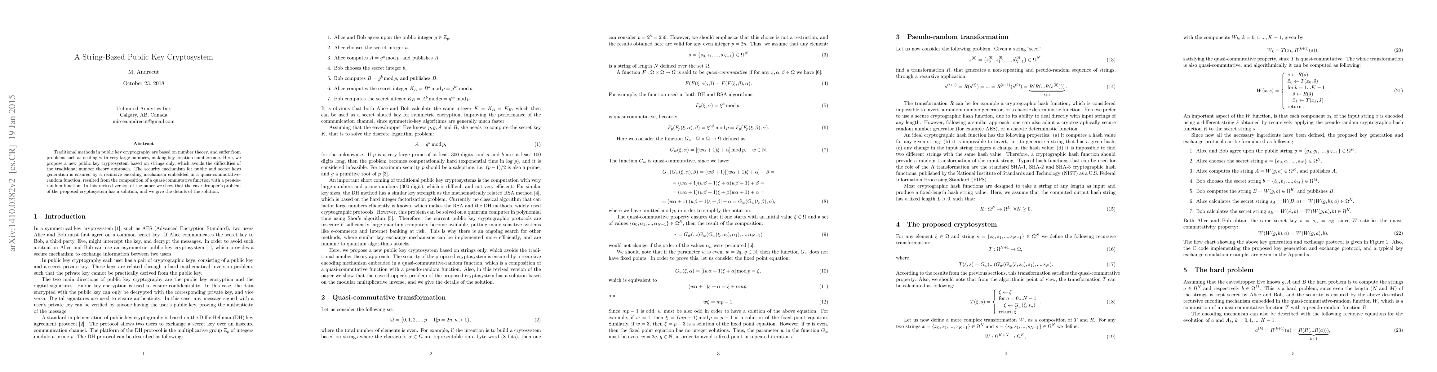 Traditional methods in public key cryptography are based on number theory, and suffer from problems such as dealing with very large numbers, making key creation cumbersome. Here, we propose a new public key cryptosystem based on strings only, which avoids the difficulties of the traditional number theory approach. The security mechanism for public and secret keys generation is ensured by a recursive encoding mechanism embedded in a quasi-commutative-random function, resulted from the composition of a quasi-commutative function with a pseudo-random function. In this revised version of the paper we show that the eavesdropper's problem of the proposed cryptosystem has a solution, and we give the details of the solution.