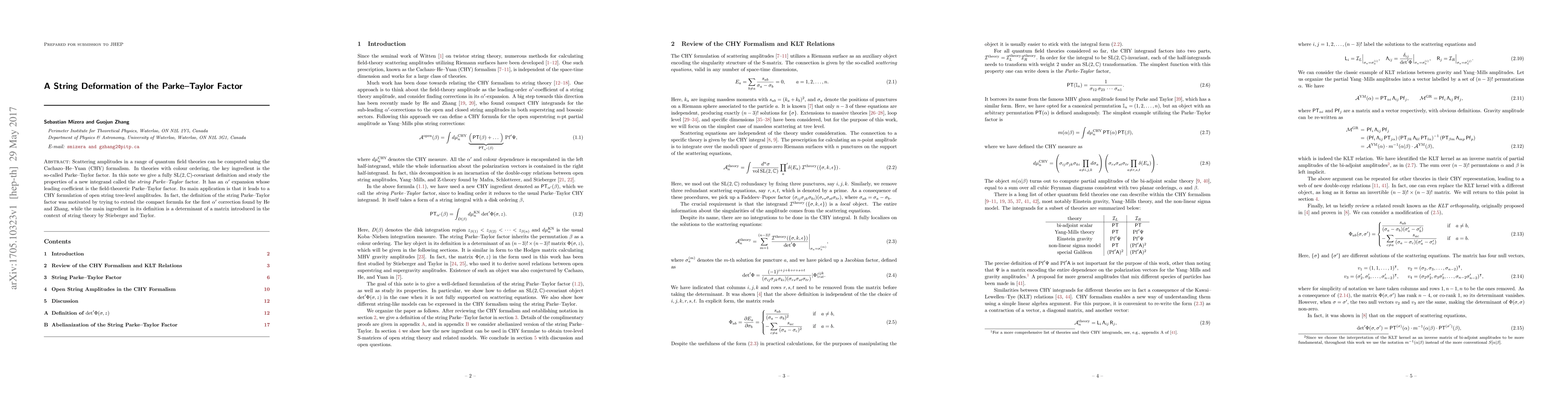 This paper introduces a string-theoretic deformation of the Parke-Taylor factor within the Cachazo-He-Yuan formalism, proposing a new $\text{SL}(2,\mathbb{C})$-covariant integrand. The main application is a CHY formulation for open string tree-level amplitudes, utilizing an $\alpha'$ expansion with the Parke-Taylor factor as its leading coefficient.
