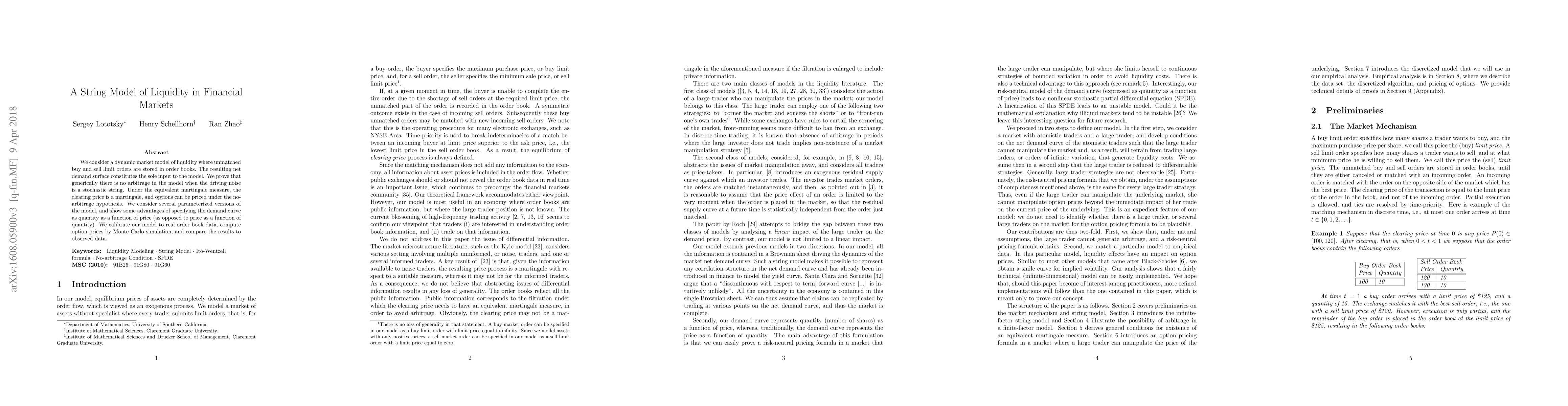 We consider a dynamic market model of liquidity where unmatched buy and sell limit orders are stored in order books. The resulting net demand surface constitutes the sole input to the model. We prove that generically there is no arbitrage in the model when the driving noise is a stochastic string. Under the equivalent martingale measure, the clearing price is a martingale, and options can be priced under the no-arbitrage hypothesis. We consider several parameterized versions of the model, and show some advantages of specifying the demand curve as quantity as a function of price (as opposed to price as a function of quantity). We calibrate our model to real order book data, compute option prices by Monte Carlo simulation, and compare the results to observed data.
