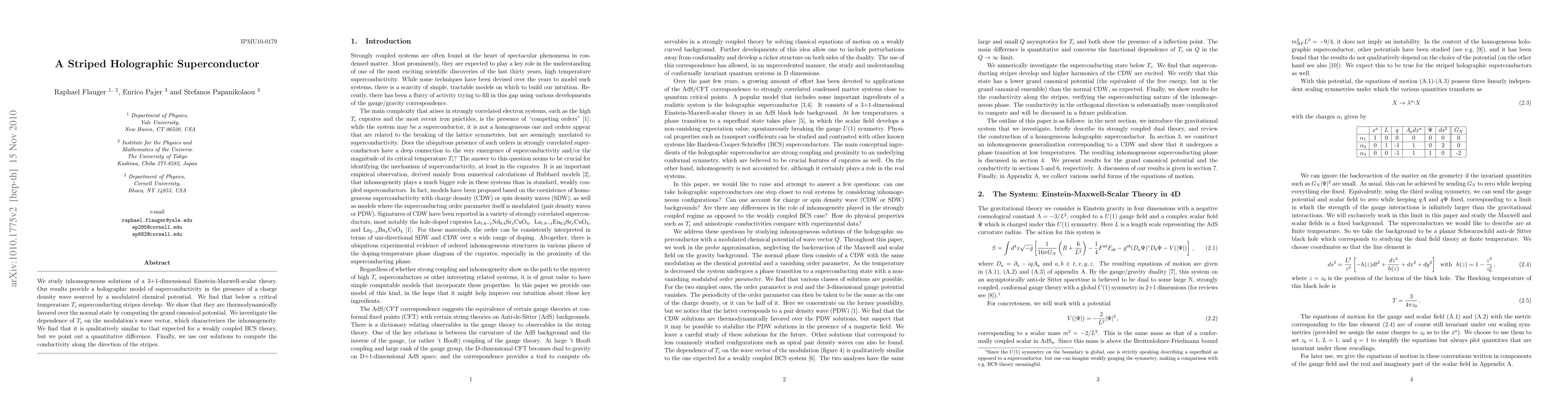 Researchers develop a holographic model for superconductivity in the presence of a charge density wave, finding that below a critical temperature, thermally favored striped superconductors form with characteristics similar to those in a weakly coupled BCS theory.