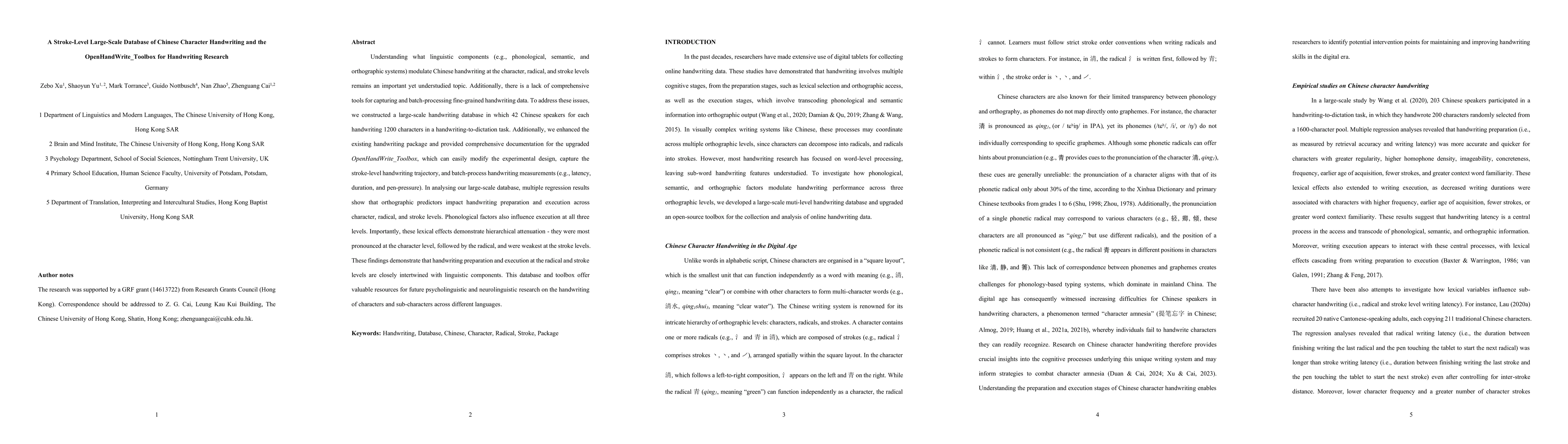 Understanding what linguistic components (e.g., phonological, semantic, and orthographic systems) modulate Chinese handwriting at the character, radical, and stroke levels remains an important yet understudied topic. Additionally, there is a lack of comprehensive tools for capturing and batch-processing fine-grained handwriting data. To address these issues, we constructed a large-scale handwriting database in which 42 Chinese speakers for each handwriting 1200 characters in a handwriting-to-dictation task. Additionally, we enhanced the existing handwriting package and provided comprehensive documentation for the upgraded OpenHandWrite_Toolbox, which can easily modify the experimental design, capture the stroke-level handwriting trajectory, and batch-process handwriting measurements (e.g., latency, duration, and pen-pressure). In analysing our large-scale database, multiple regression results show that orthographic predictors impact handwriting preparation and execution across character, radical, and stroke levels. Phonological factors also influence execution at all three levels. Importantly, these lexical effects demonstrate hierarchical attenuation - they were most pronounced at the character level, followed by the radical, and were weakest at the stroke levels. These findings demonstrate that handwriting preparation and execution at the radical and stroke levels are closely intertwined with linguistic components. This database and toolbox offer valuable resources for future psycholinguistic and neurolinguistic research on the handwriting of characters and sub-characters across different languages.