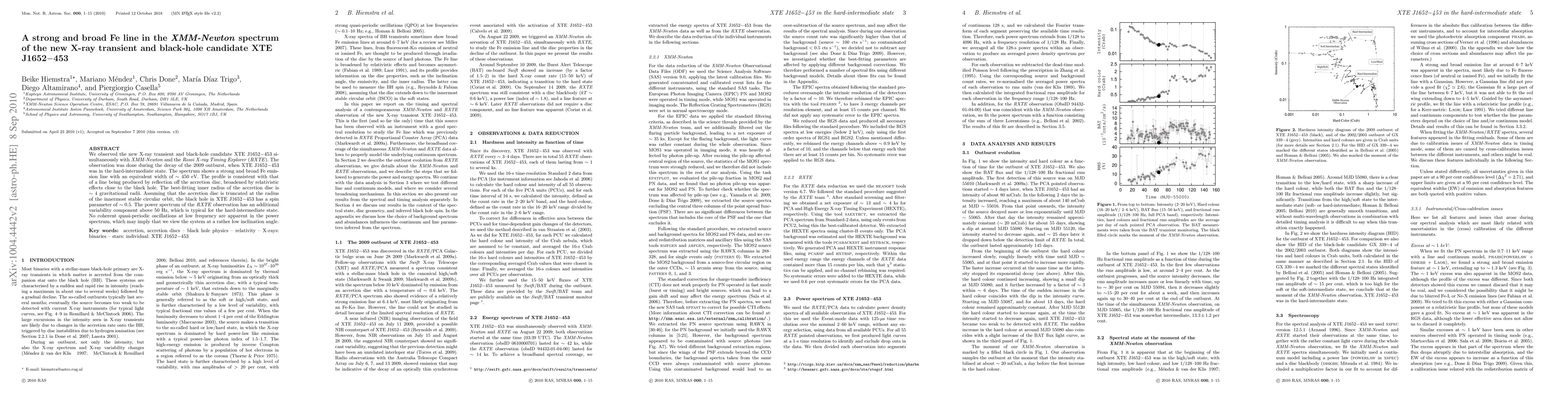 The XMM-Newton spectrum of XTE J1652-453 shows a strong and broad iron emission line with an equivalent width of ~ 450 eV, indicating reflection off the accretion disk near a black hole with spin parameter ~ 0.5.
