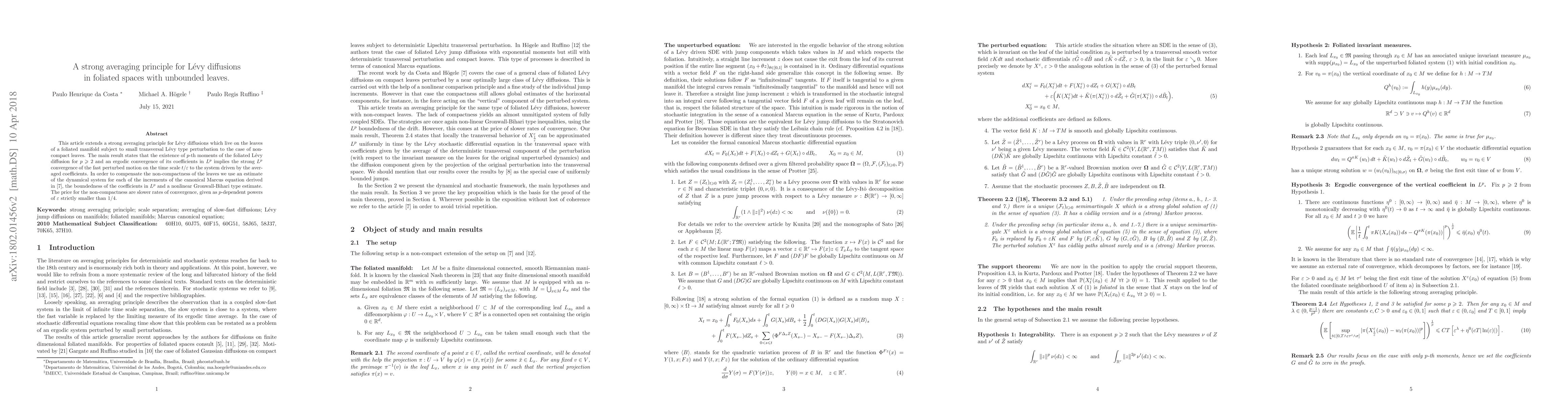 This paper extends the strong averaging principle for Lévy diffusions on foliated spaces with non-compact leaves, showing that $p$-th moments and ergodic convergence of coefficients lead to $L^p$ convergence of perturbed motion. The slower convergence rates due to non-compactness are compensated using estimates from Marcus equations and nonlinear Gronwall-Bihari inequalities.