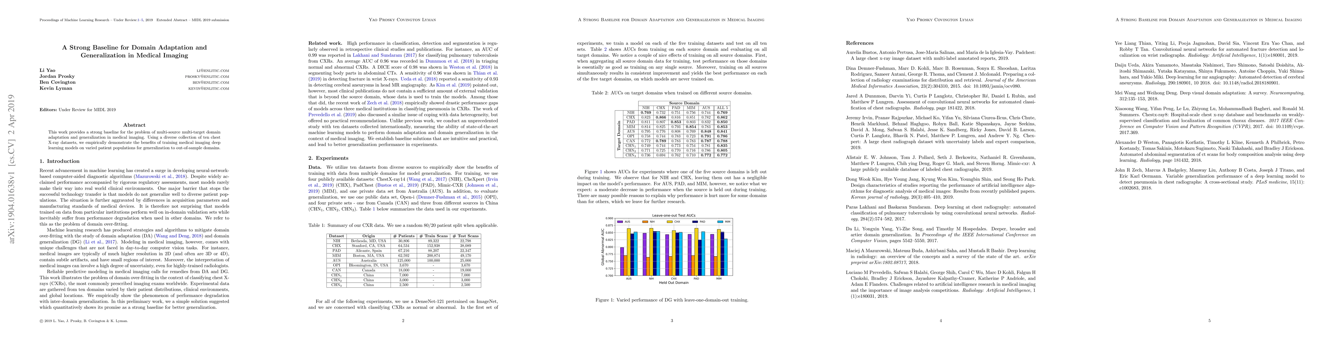 This paper establishes a robust baseline for domain adaptation and generalization in medical imaging, showcasing the advantages of training deep learning models on diverse chest X-ray datasets to improve performance on unseen patient populations. The study highlights the effectiveness of multi-source training for better generalization across different medical imaging domains.
