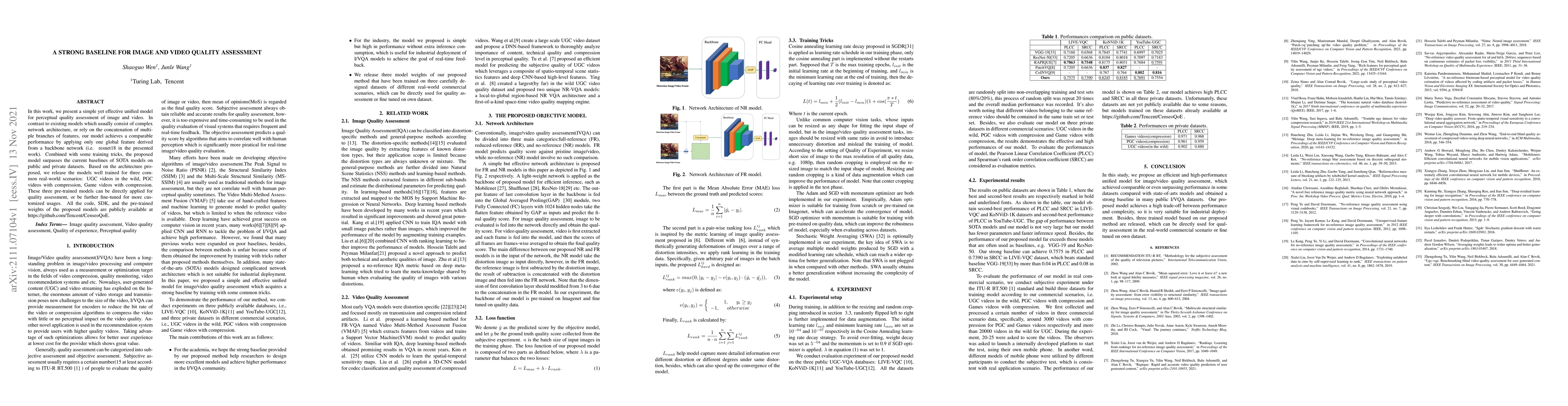 In this work, we present a simple yet effective unified model for perceptual quality assessment of image and video. In contrast to existing models which usually consist of complex network architecture, or rely on the concatenation of multiple branches of features, our model achieves a comparable performance by applying only one global feature derived from a backbone network (i.e. resnet18 in the presented work). Combined with some training tricks, the proposed model surpasses the current baselines of SOTA models on public and private datasets. Based on the architecture proposed, we release the models well trained for three common real-world scenarios: UGC videos in the wild, PGC videos with compression, Game videos with compression. These three pre-trained models can be directly applied for quality assessment, or be further fine-tuned for more customized usages. All the code, SDK, and the pre-trained weights of the proposed models are publicly available at https://github.com/Tencent/CenseoQoE.