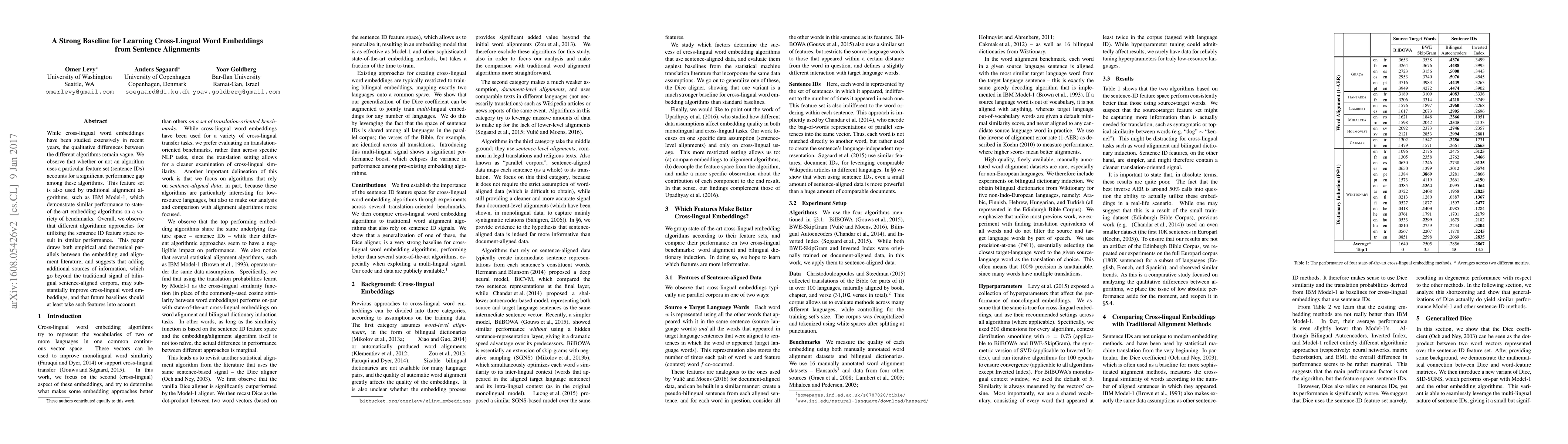 This paper establishes a strong baseline for cross-lingual word embeddings by leveraging sentence alignments, noting that the use of sentence IDs significantly impacts performance. It suggests that future improvements should consider additional information beyond traditional bilingual corpora.