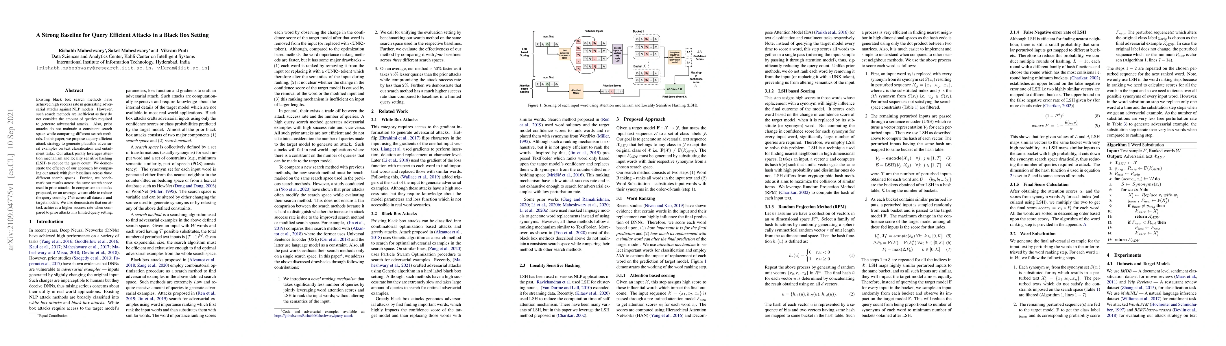 This paper proposes a query efficient attack strategy for black box adversarial attacks in NLP, leveraging attention mechanisms and locality sensitive hashing to significantly reduce query count while maintaining a high success rate. The approach outperforms four baselines and reduces query count by 75% on average across various datasets and models.