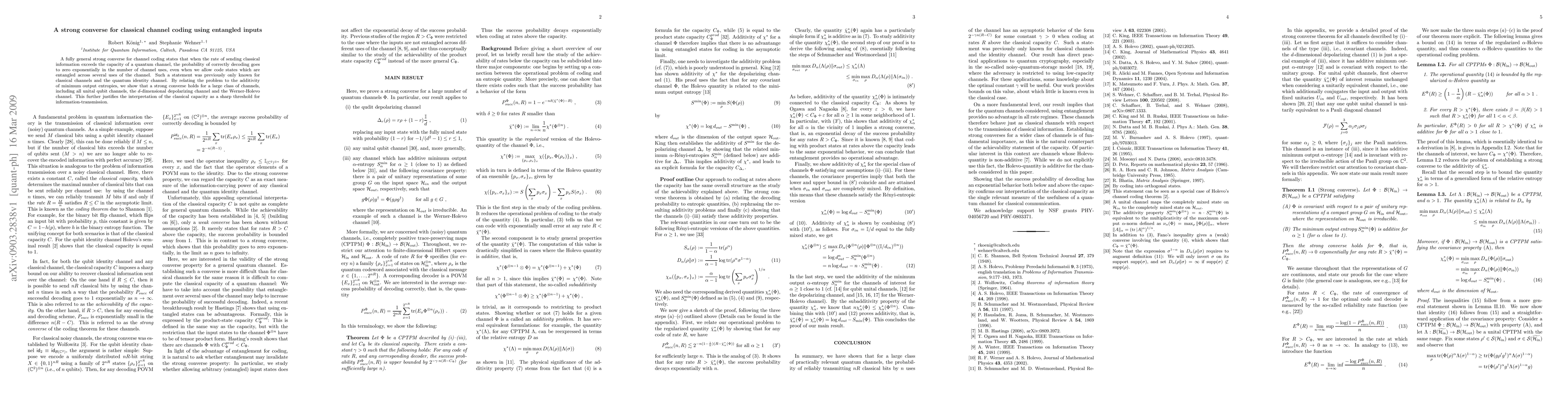 This paper establishes a strong converse for classical channel coding using entangled inputs, proving that exceeding the channel capacity results in exponentially vanishing decoding probability. It extends this result to a wide range of quantum channels, reinforcing the notion of a sharp threshold for information transmission.