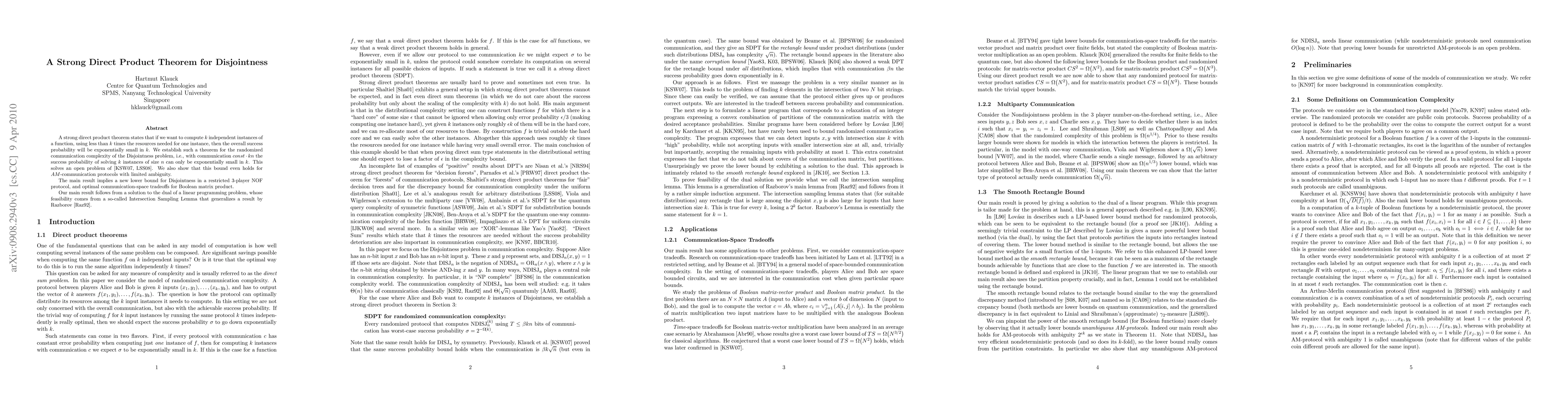 This paper establishes a strong direct product theorem for the randomized communication complexity of the Disjointness problem, showing that solving multiple instances requires exponentially more resources than a single instance, even for $AM$ protocols. The result also provides new lower bounds for Disjointness in 3-player NOF protocols and optimal communication-space tradeoffs for Boolean matrix product.