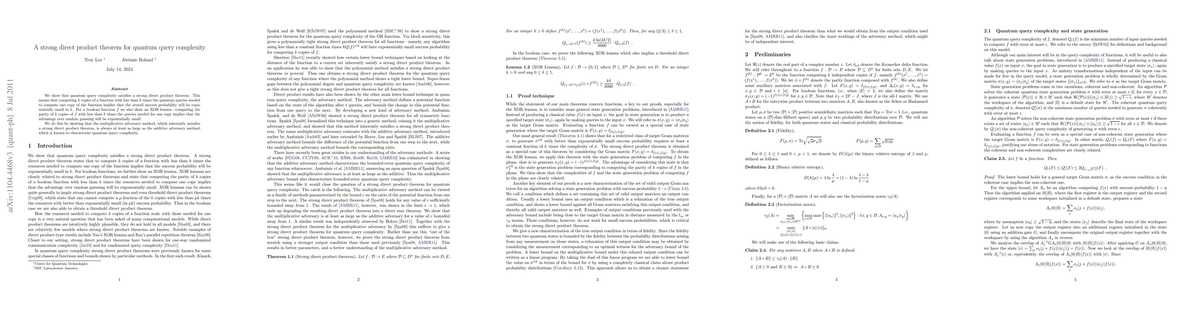 This paper demonstrates that quantum query complexity adheres to a strong direct product theorem, ensuring exponentially small success probability when computing multiple instances of a function with fewer queries than needed for a single instance. It also establishes an XOR lemma for boolean functions, showing similar exponential smallness in advantage over random guessing. The proof leverages the multiplicative adversary method, which is shown to be at least as large as the additive adversary method characterizing quantum query complexity.