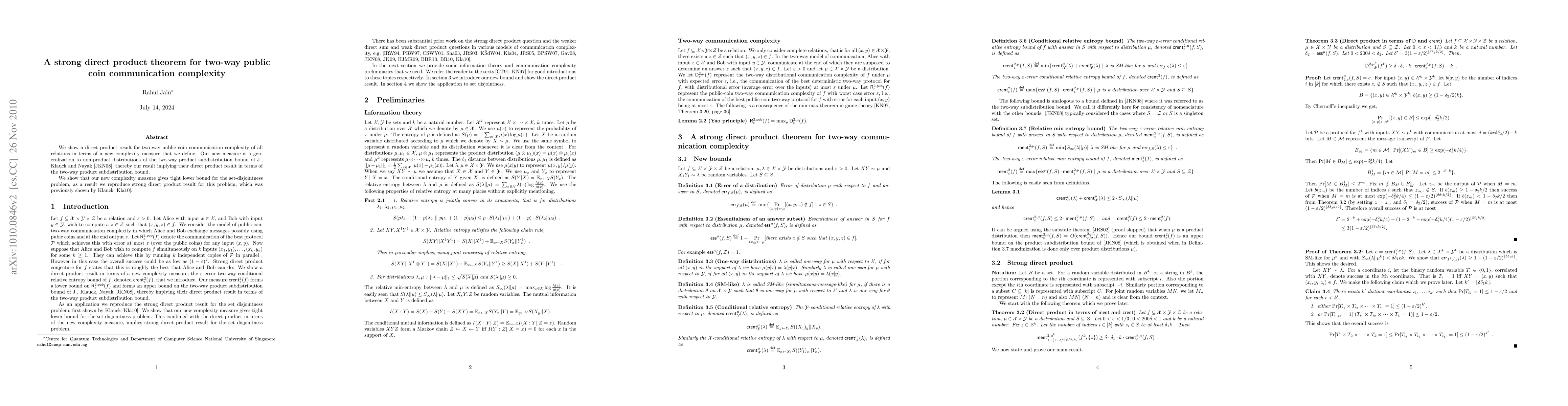 This paper presents a new complexity measure for two-way public coin communication complexity, generalizing a previous subdistribution bound. It demonstrates that this measure provides a tight lower bound for the set-disjointness problem, thereby reproducing a strong direct product result for this problem.