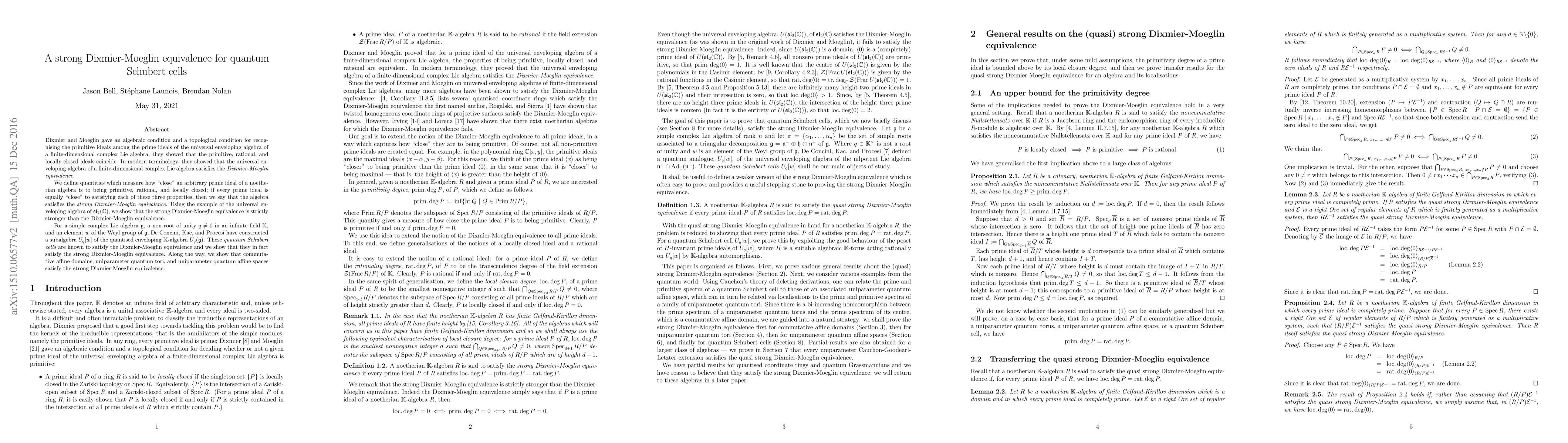 Dixmier and Moeglin gave an algebraic condition and a topological condition for recognising the primitive ideals among the prime ideals of the universal enveloping algebra of a finite-dimensional complex Lie algebra; they showed that the primitive, rational, and locally closed ideals coincide. In modern terminology, they showed that the universal enveloping algebra of a finite-dimensional complex Lie algebra satisfies the Dixmier-Moeglin equivalence. We define quantities which measure how "close" an arbitrary prime ideal of a noetherian algebra is to being primitive, rational, and locally closed; if every prime ideal is equally "close" to each of these three properties, then we say that the algebra satisfies the strong Dixmier-Moeglin equivalence. Using the example of the universal enveloping algebra of sl_2(C), we show that the strong Dixmier-Moeglin equivalence is stronger than the Dixmier-Moeglin equivalence. For a simple complex Lie algebra g, a non root of unity q\neq 0 in an infinite field K, and an element w of the Weyl group of g, De Concini, Kac, and Procesi have constructed a subalgebra U_q[w] of the quantised enveloping K-algebra U_q(g). These quantum Schubert cells U_q[w] are known to satisfy the Dixmier-Moeglin equivalence and we show that they in fact satisfy the strong Dixmier-Moeglin equivalence. Along the way, we show that commutative affine domains, uniparameter quantum tori, and uniparameter quantum affine spaces satisfy the strong Dixmier-Moeglin equivalence.