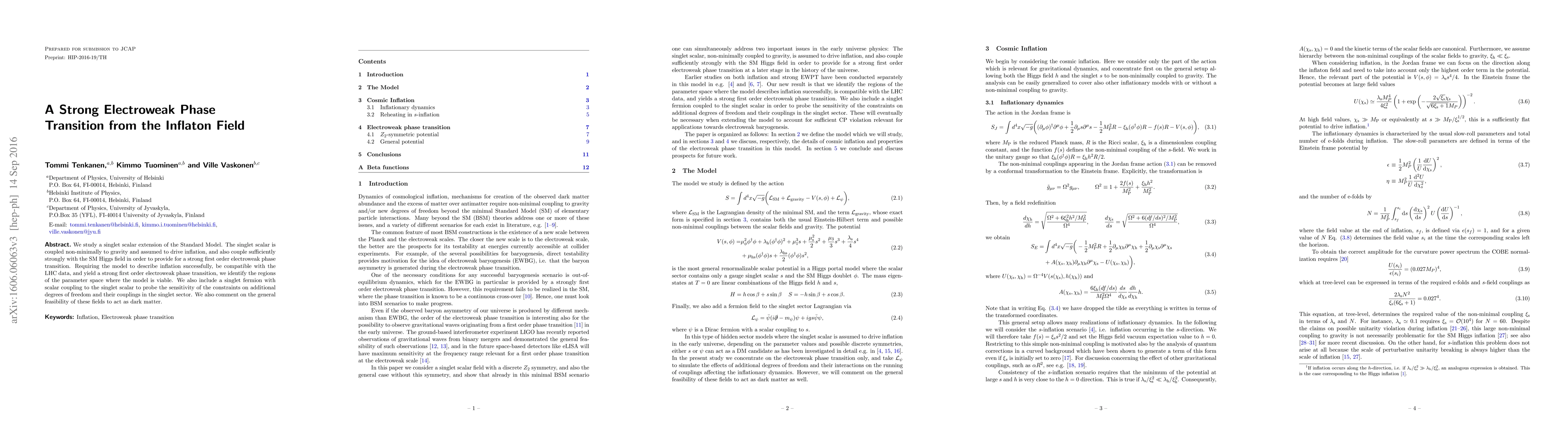 We study a singlet scalar extension of the Standard Model. The singlet scalar is coupled non-minimally to gravity and assumed to drive inflation, and also couple sufficiently strongly with the SM Higgs field in order to provide for a strong first order electroweak phase transition. Requiring the model to describe inflation successfully, be compatible with the LHC data, and yield a strong first order electroweak phase transition, we identify the regions of the parameter space where the model is viable. We also include a singlet fermion with scalar coupling to the singlet scalar to probe the sensitivity of the constraints on additional degrees of freedom and their couplings in the singlet sector. We also comment on the general feasibility of these fields to act as dark matter.