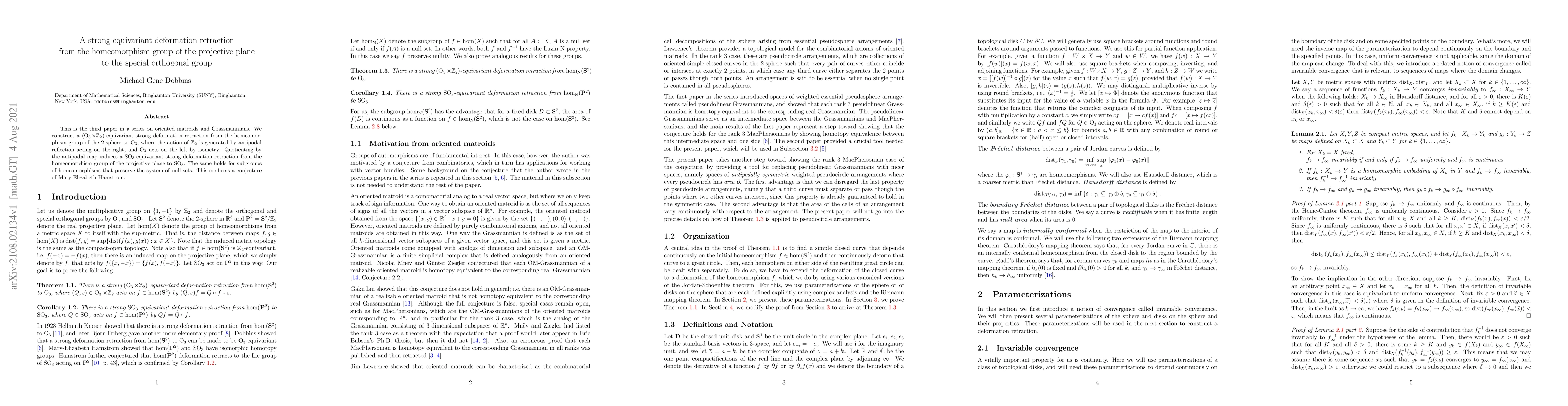 This is the third paper in a series on oriented matroids and Grassmannians. We construct a $(\mathrm{O}_3\times\mathbb{Z}_2)$-equivariant strong deformation retraction from the homeomorphism group of the 2-sphere to $\mathrm{O}_3$, where the action of $\mathbb{Z}_2$ is generated by antipodal reflection acting on the right, and $\mathrm{O}_3$ acts on the left by isometry. Quotienting by the antipodal map induces a $\mathrm{SO}_3$-equivariant strong deformation retraction from the homeomorphism group of the projective plane to $\mathrm{SO}_3$. The same holds for subgroups of homeomorphisms that preserve the system of null sets. This confirms a conjecture of Mary-Elizabeth Hamstrom.