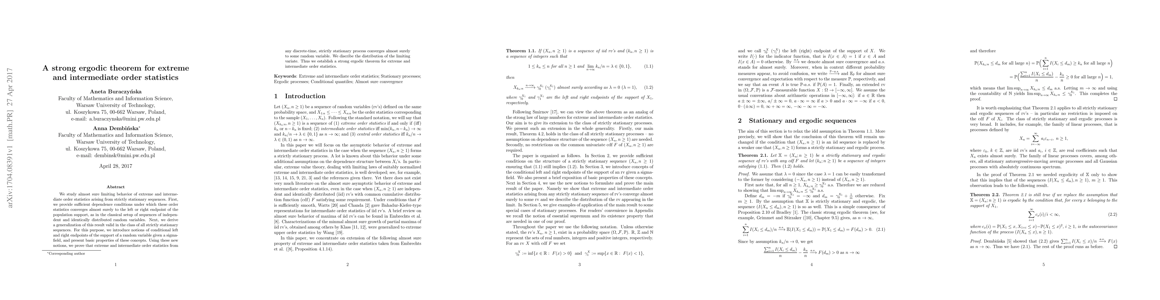 We study almost sure limiting behavior of extreme and intermediate order statistics arising from strictly stationary sequences. First, we provide sufficient dependence conditions under which these order statistics converges almost surely to the left or right endpoint of the population support, as in the classical setup of sequences of independent and identically distributed random variables. Next, we derive a generalization of this result valid in the class of all strictly stationary sequences. For this purpose, we introduce notions of conditional left and right endpoints of the support of a random variable given a sigma-field, and present basic properties of these concepts. Using these new notions, we prove that extreme and intermediate order statistics from any discrete-time, strictly stationary process converges almost surely to some random variable. We discribe the distribution of the limiting variate. Thus we establish a strong ergodic theorem for extreme and intermediate order statistics.