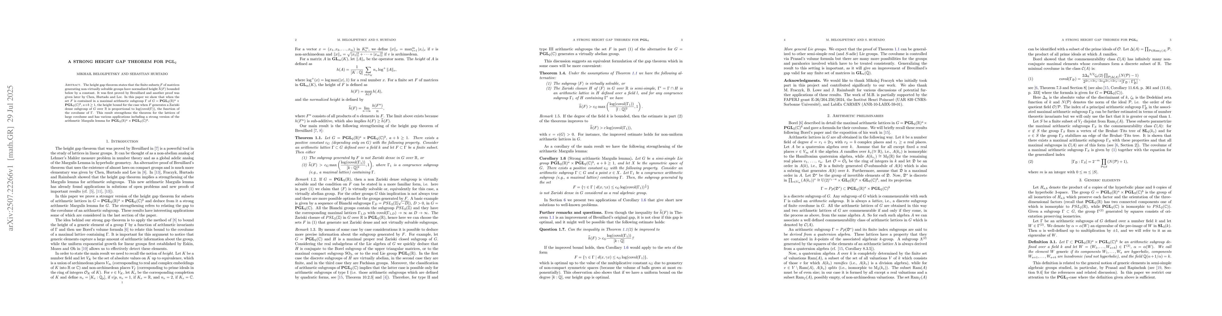 The height gap theorem states that the finite subsets $F$ of matrices generating non-virtually solvable groups have normalized height $\widehat{h}(F)$ bounded below by a constant. It was first proved by Breuillard and another proof was given later by Chen, Hurtado and Lee. In this paper we show that when the set $F$ is contained in a maximal arithmetic subgroup $\Gamma$ of $G = PGL_2(\mathbb{R})^a \times PGL_2(\mathbb{C})^b$, $a+b \ge 1$, the height bound for the case when $F$ generates a Zariski dense subgroup of $G$ over $\mathbb{R}$ is proportional to $\log(covol(\Gamma))$, the function of the covolume of $\Gamma$. This result strengthens the theorem for the lattices of large covolume and has various applications including a strong version of the arithmetic Margulis lemma for $PGL_2(\mathbb{R})^a \times PGL_2(\mathbb{C})^b$.