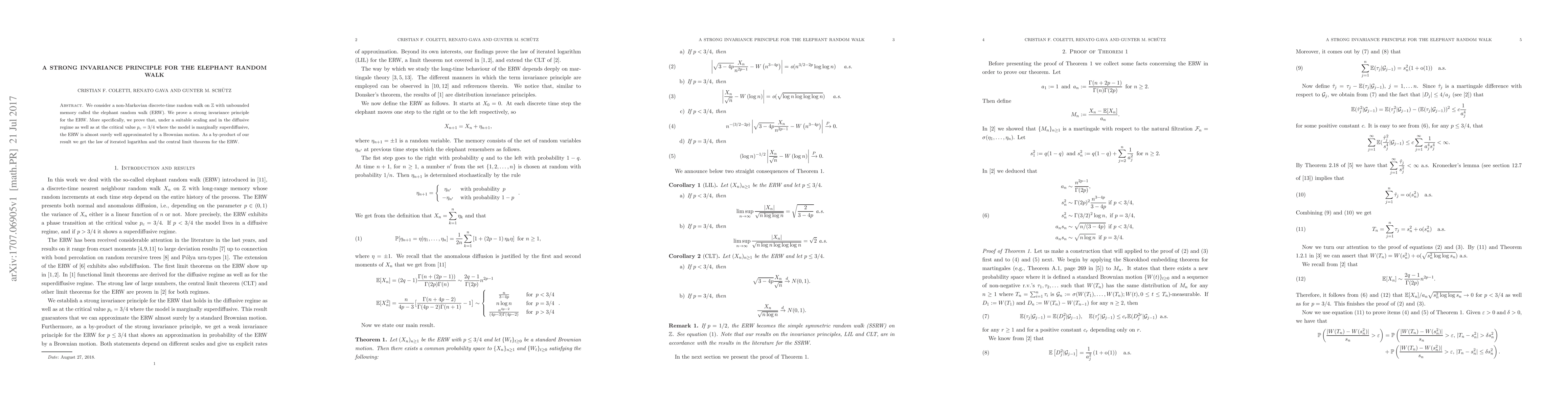 This research establishes a strong invariance principle for the Elephant Random Walk (ERW), a non-Markovian random walk with unbounded memory. It proves that the ERW, scaled appropriately, approximates Brownian motion in both diffusive and critical regimes, also deriving the law of iterated logarithm and central limit theorem for the ERW.