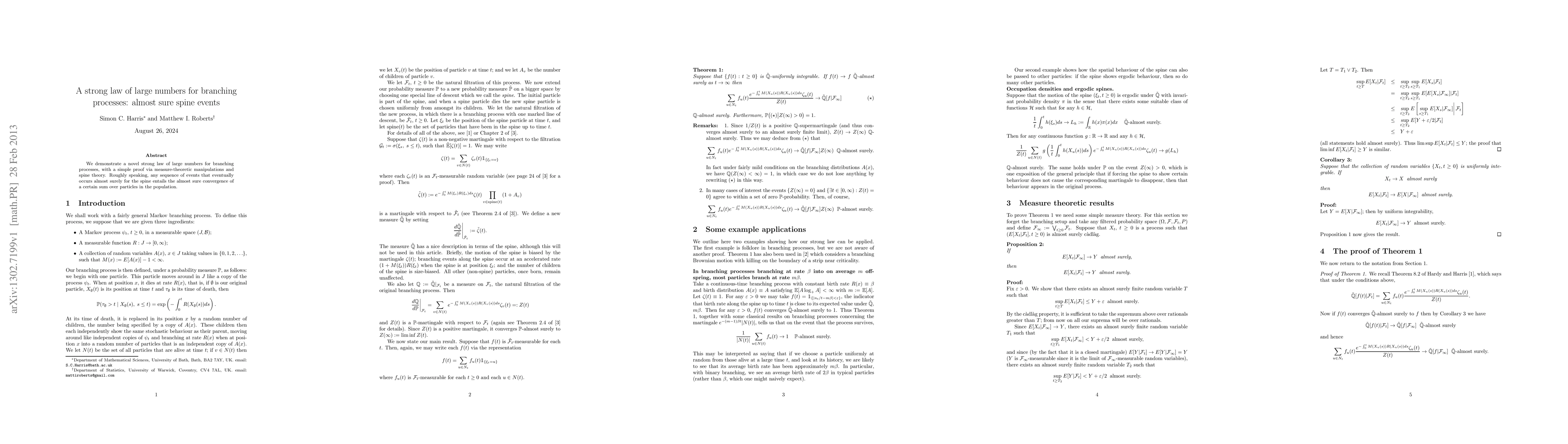 Summary: This paper establishes a strong law of large numbers for branching processes using measure-theoretic techniques and spine theory, proving that almost sure convergence of events on the spine guarantees the convergence of a sum over population particles.