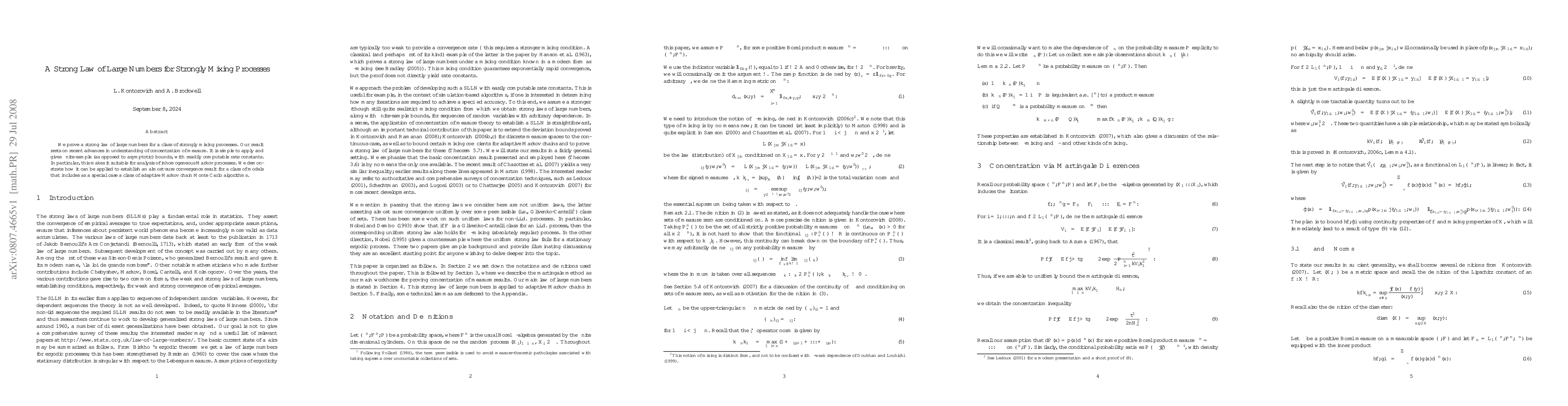 This paper proves a strong law of large numbers for strongly mixing processes, leveraging recent concentration of measure advances to provide finite-sample bounds with computable rate constants. It is particularly applicable to inhomogeneous Markov processes and adaptive Markov chain Monte Carlo algorithms.