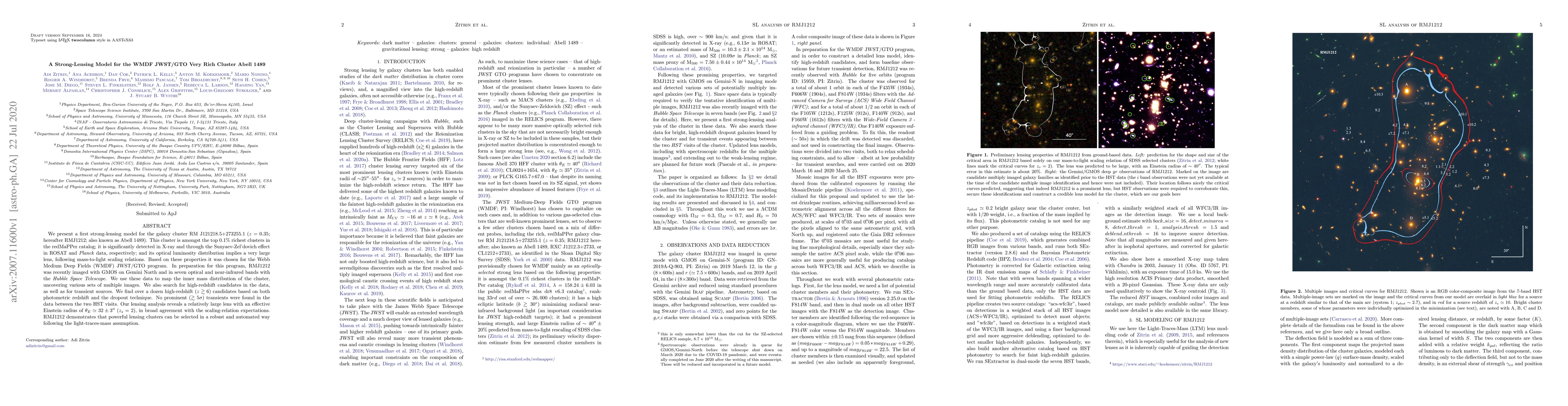 We present a first strong-lensing model for the galaxy cluster RM J121218.5+273255.1 ($z=0.35$; hereafter RMJ1212; also known as Abell 1489). This cluster is amongst the top 0.1\% richest clusters in the redMaPPer catalog; it is significantly detected in X-ray and through the Sunyaev-Zel'dovich effect in ROSAT and \emph{Planck} data, respectively; and its optical luminosity distribution implies a very large lens, following mass-to-light scaling relations. Based on these properties it was chosen for the Webb Medium Deep Fields (WMDF) JWST/GTO program. In preparation for this program, RMJ1212 was recently imaged with GMOS on Gemini North and in seven optical and near-infrared bands with the \emph{Hubble Space Telescope}. We use these data to map the inner mass distribution of the cluster, uncovering various sets of multiple images. We also search for high-redshift candidates in the data, as well as for transient sources. We find over a dozen high-redshift ($z\gtrsim6$) candidates based on both photometric redshift and the dropout technique. No prominent ($\gtrsim5 \sigma$) transients were found in the data between the two HST visits. Our lensing analysis reveals a relatively large lens with an effective Einstein radius of $\theta_{E}\simeq32\pm3''$ ($z_{s}=2$), in broad agreement with the scaling-relation expectations. RMJ1212 demonstrates that powerful lensing clusters can be selected in a robust and automated way following the light-traces-mass assumption.