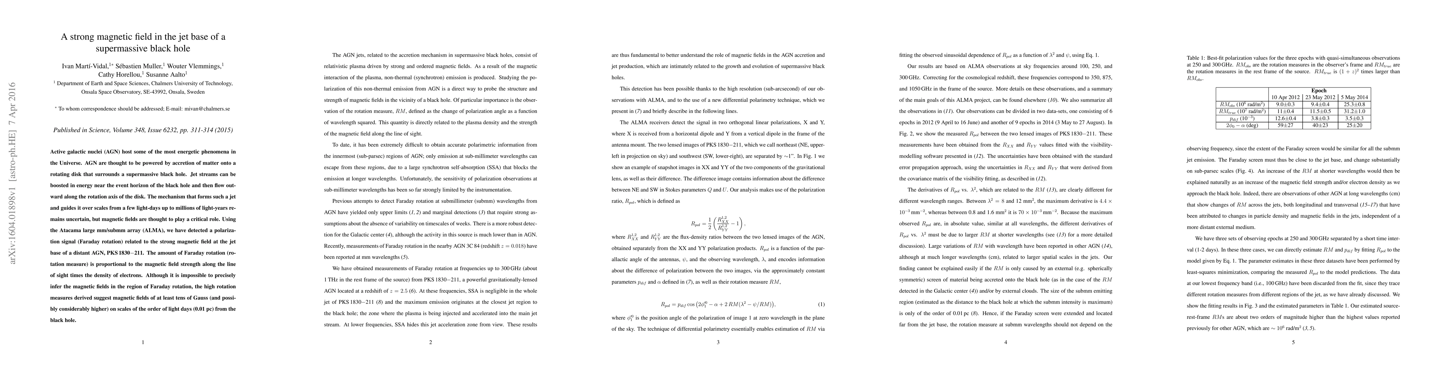This paper reports the detection of a strong magnetic field at the base of a jet from a supermassive black hole in the AGN PKS1830-211 using ALMA, revealing Faraday rotation indicative of magnetic fields potentially reaching tens of Gauss or higher on scales near the black hole. The findings suggest magnetic fields play a crucial role in jet formation and guidance.