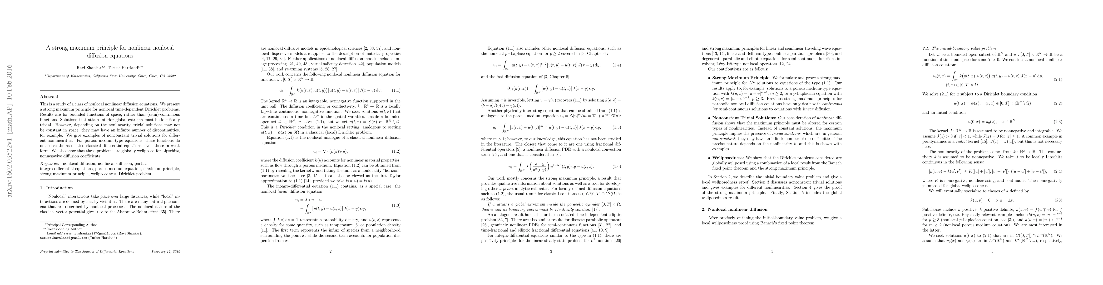 This is a study of a class of nonlocal nonlinear diffusion equations. We present a strong maximum principle for nonlocal time-dependent Dirichlet problems. Results are for bounded functions of space, rather than (semi)-continuous functions. Solutions that attain interior global extrema must be identically trivial. However, depending on the nonlinearity, trivial solutions may not be constant in space; they may have an infinite number of discontinuities, for example. We give examples of nonconstant trivial solutions for different nonlinearities. For porous medium-type equations, these functions do not solve the associated classical differential equations, even those in weak form. We also show that these problems are globally wellposed for Lipschitz, nonnegative diffusion coefficients.