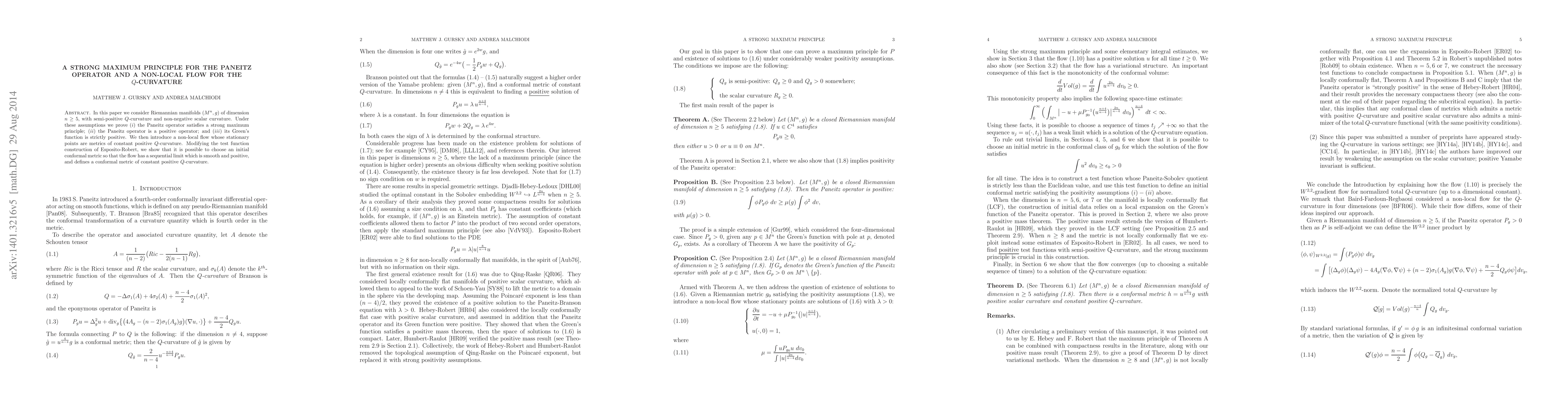 This paper proves a strong maximum principle for the Paneitz operator on Riemannian manifolds with semi-positive $Q$-curvature and non-negative scalar curvature. It also introduces a non-local flow leading to metrics of constant positive $Q$-curvature, with a method to ensure the flow converges to a smooth, positive conformal metric.
